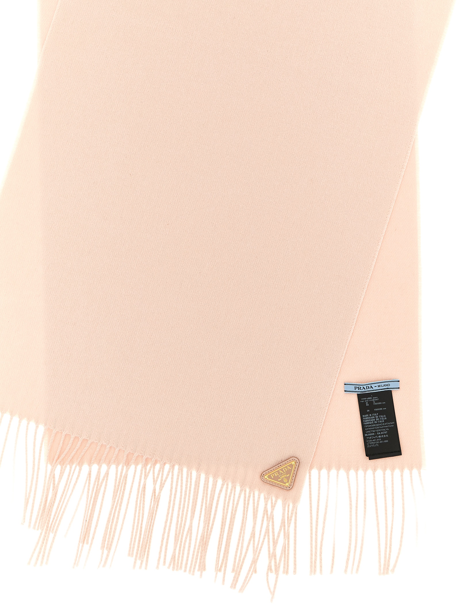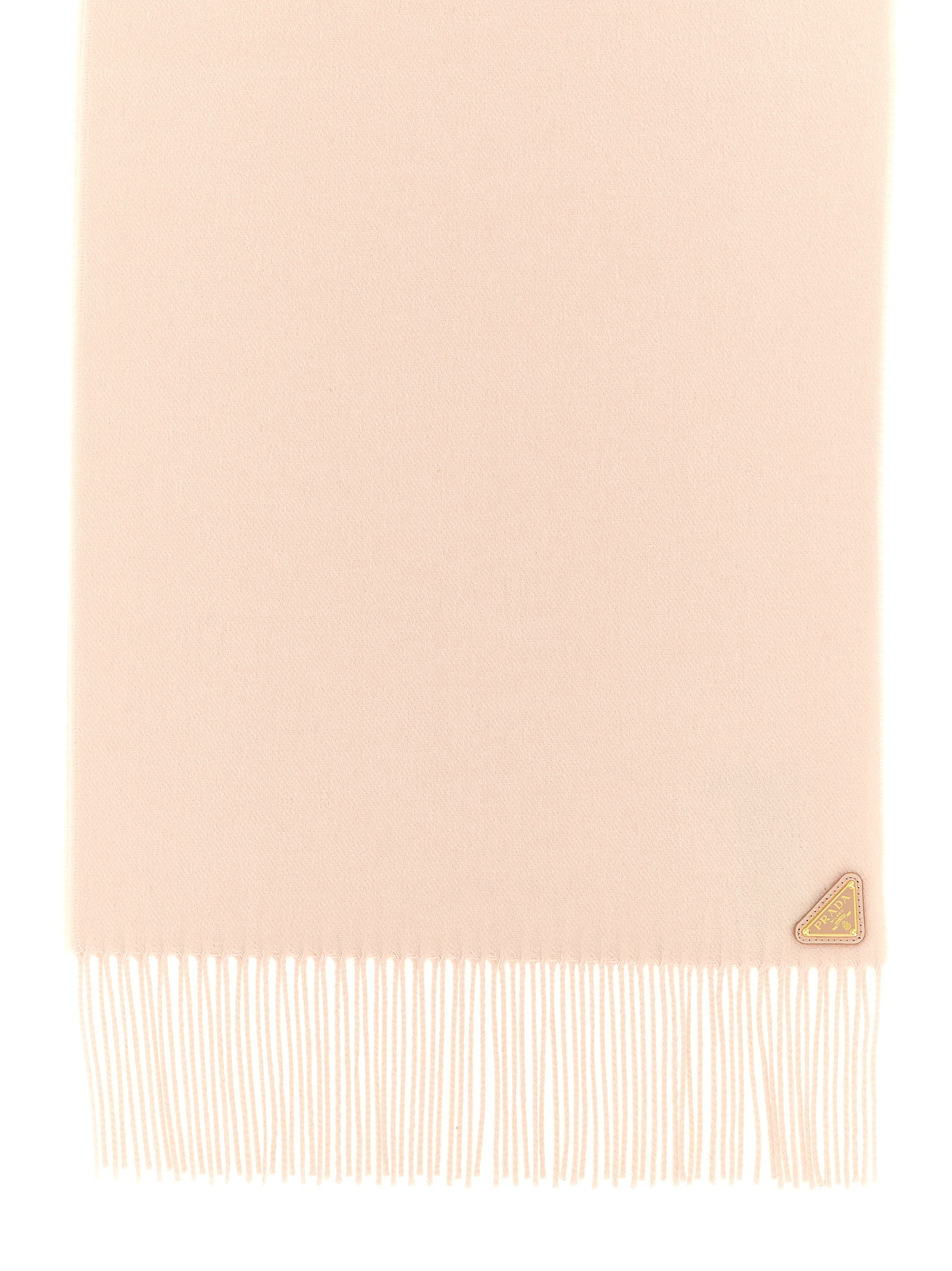 Silk and cashmere scarf, triangle logo in enameled metal, fringed edges.