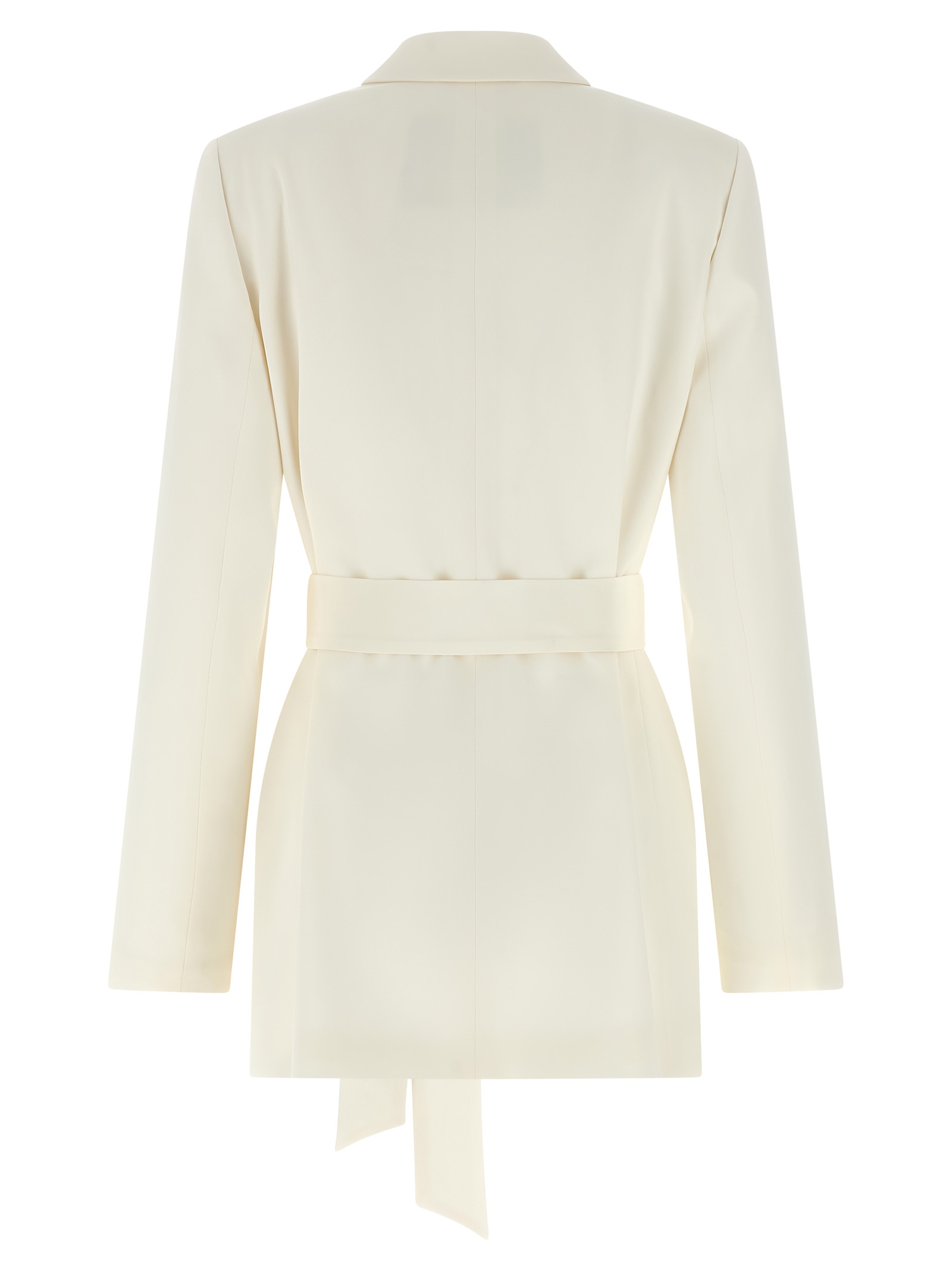 Double-breasted silk blazer with lapel neckline, front closure with horn buttons, structured shoulder straps, long sleeves with buttons, and knotted belt at the waist.