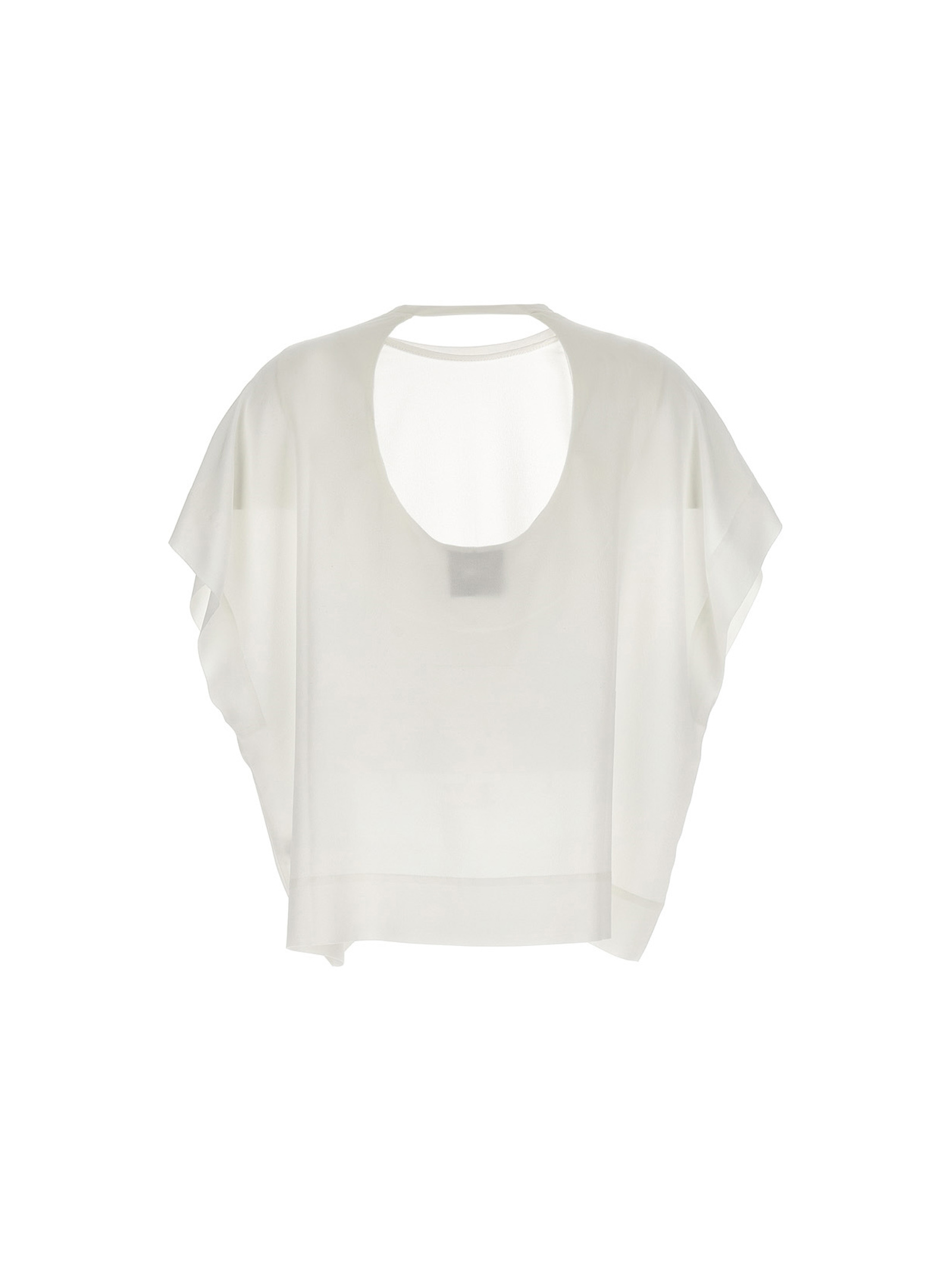 Silk crewneck bloat with back cut outs and wide short sleeves.