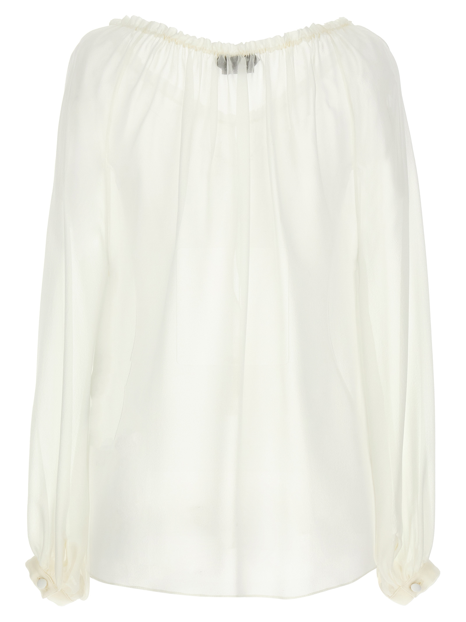 Silk georgette blouse, V-neck with adjustable drawstring to modulate the curl, long sleeves with cuffs.