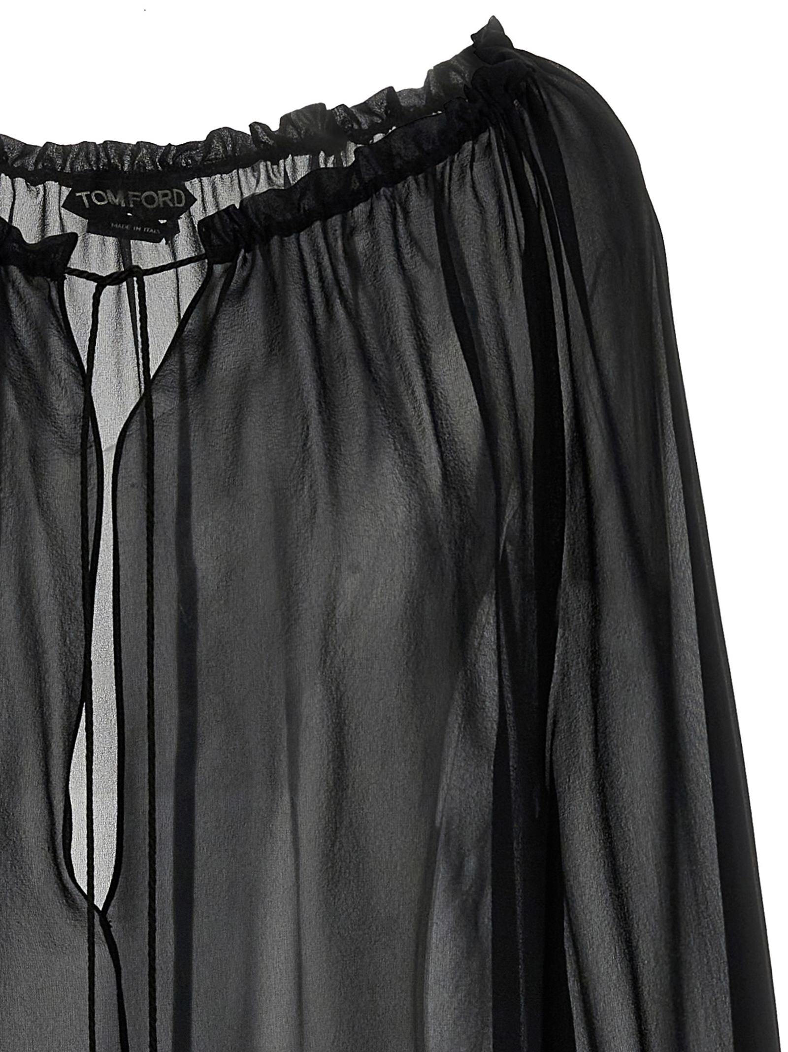 Silk georgette blouse, V-neck with adjustable drawstring to modulate the curl, long sleeves with cuffs.