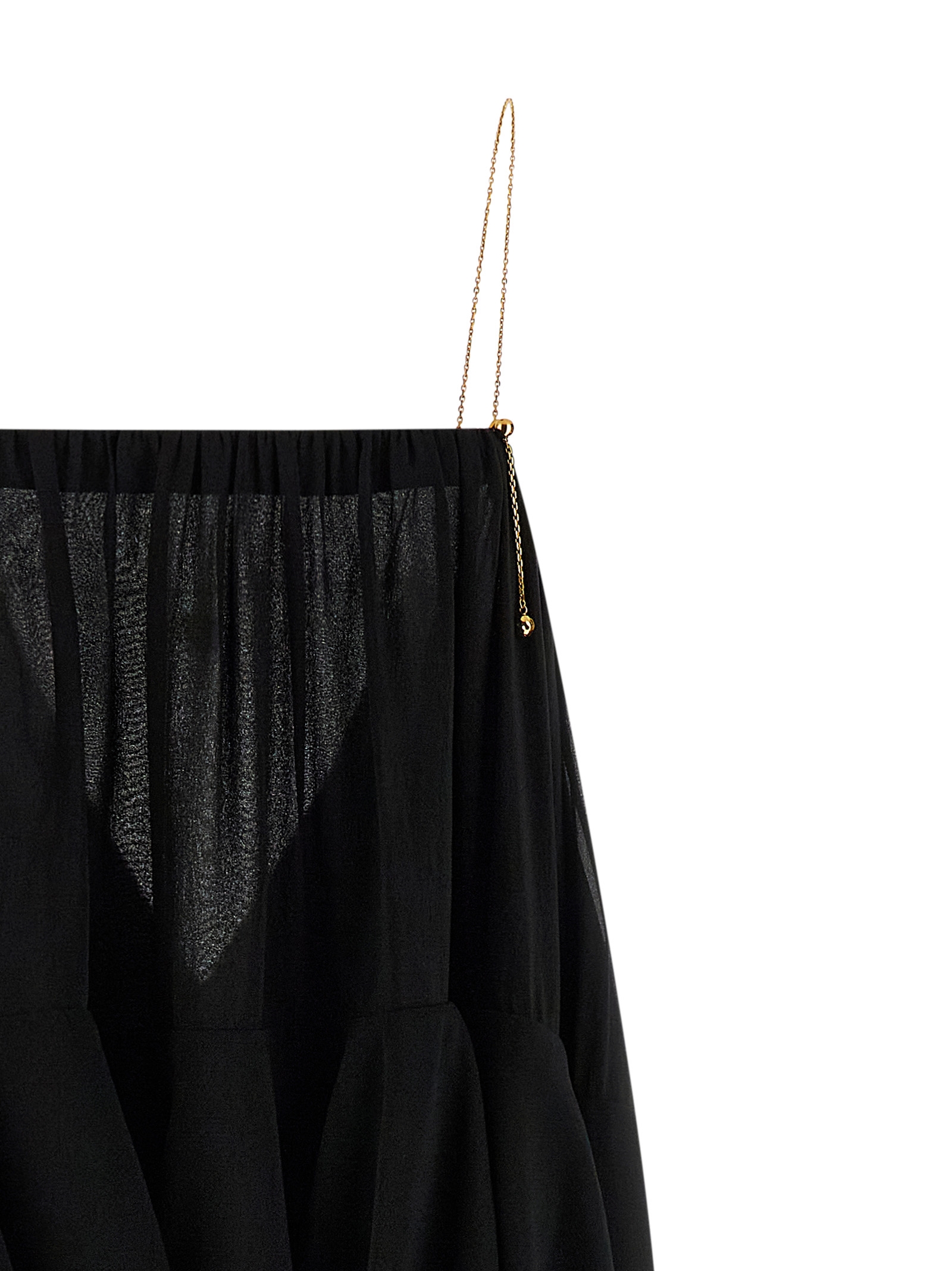 Maxi dress in silk chiffon with V-neck at the back. Gold metal chain shoulder straps, ruffles and ruffles.