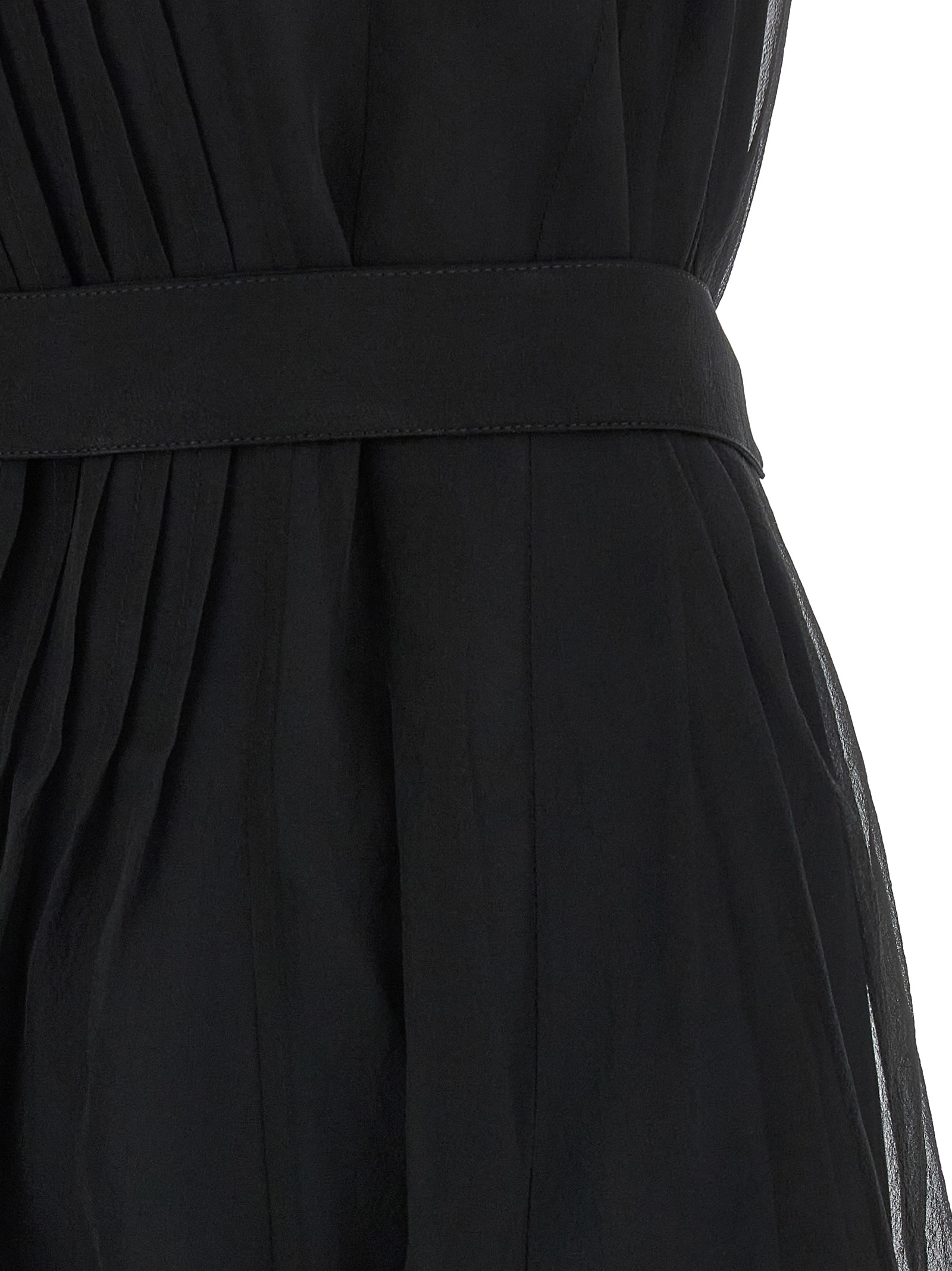 Long silk dress with pleats on the front and back, V-neck on the front and back with Monile detail on the back, sleeveless, integrated petticoat, removable matching belt.