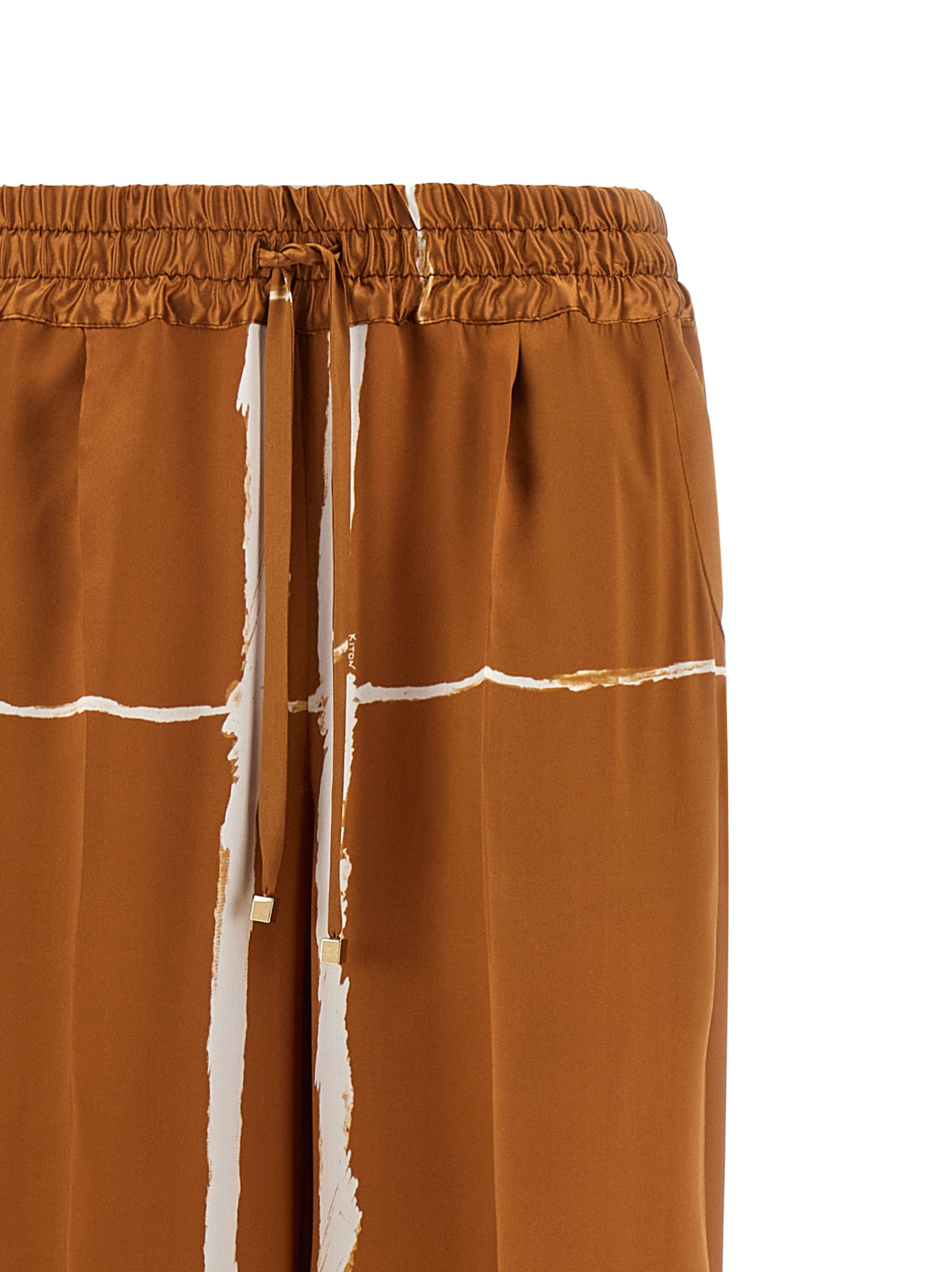 Silk satin trousers with graphic pattern, wide and straight leg, stretched pleat, elastic with drawstring at the waist, pockets.