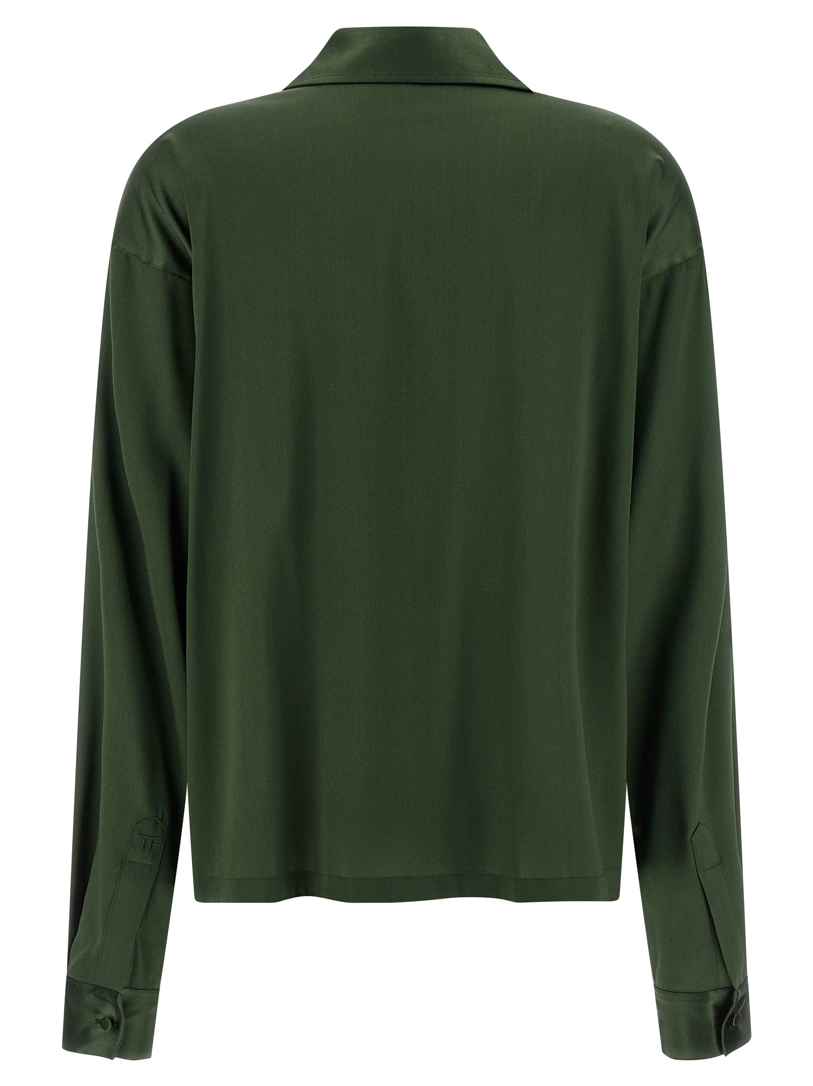 Polo shirt in stretch silk satin, collar and V-neck, long sleeves with cuffs and dropped shoulder, side slits.