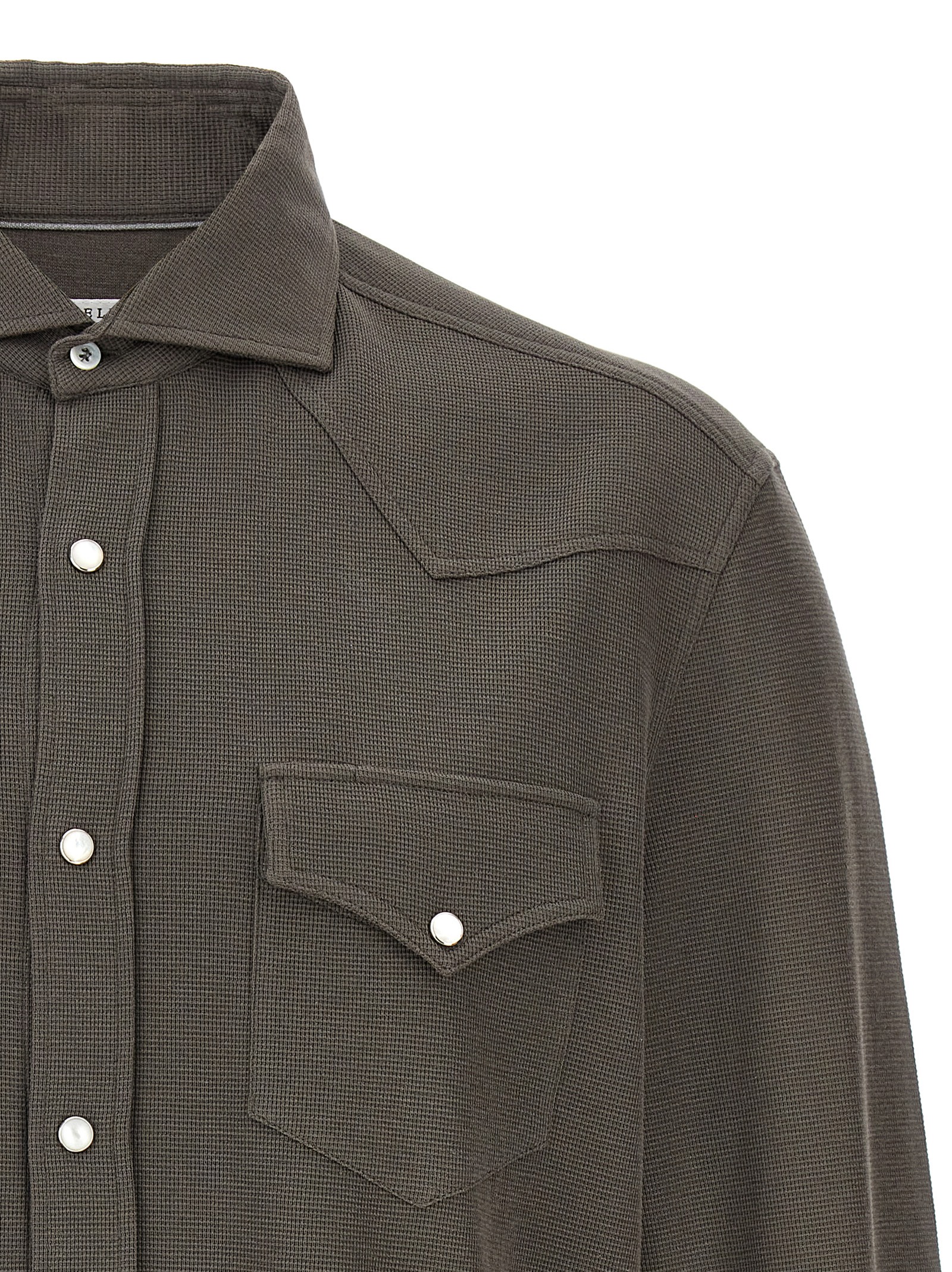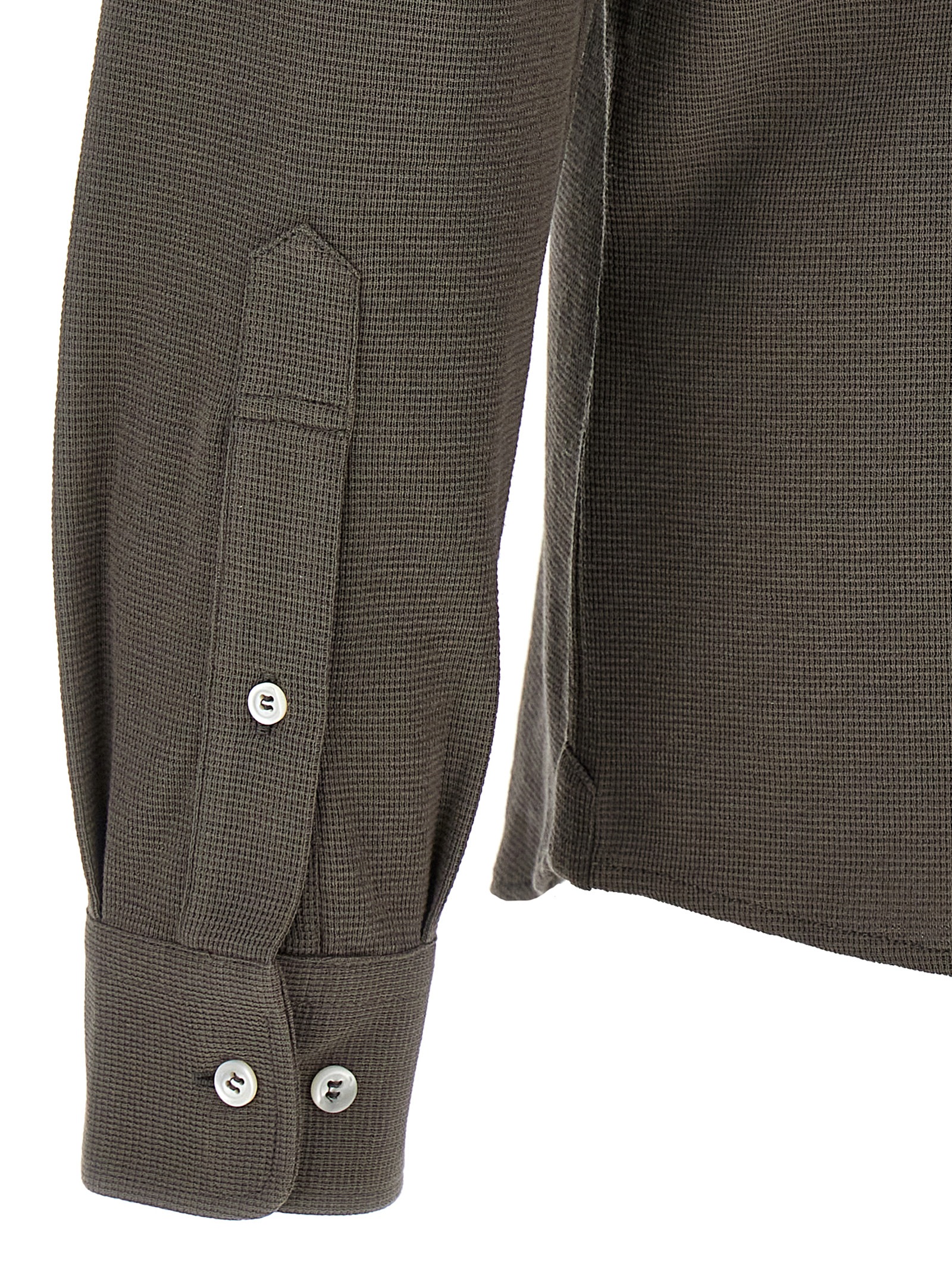 Cotton and silk blend knit shirt with front snap button closure, pockets, long cuffed sleeves.