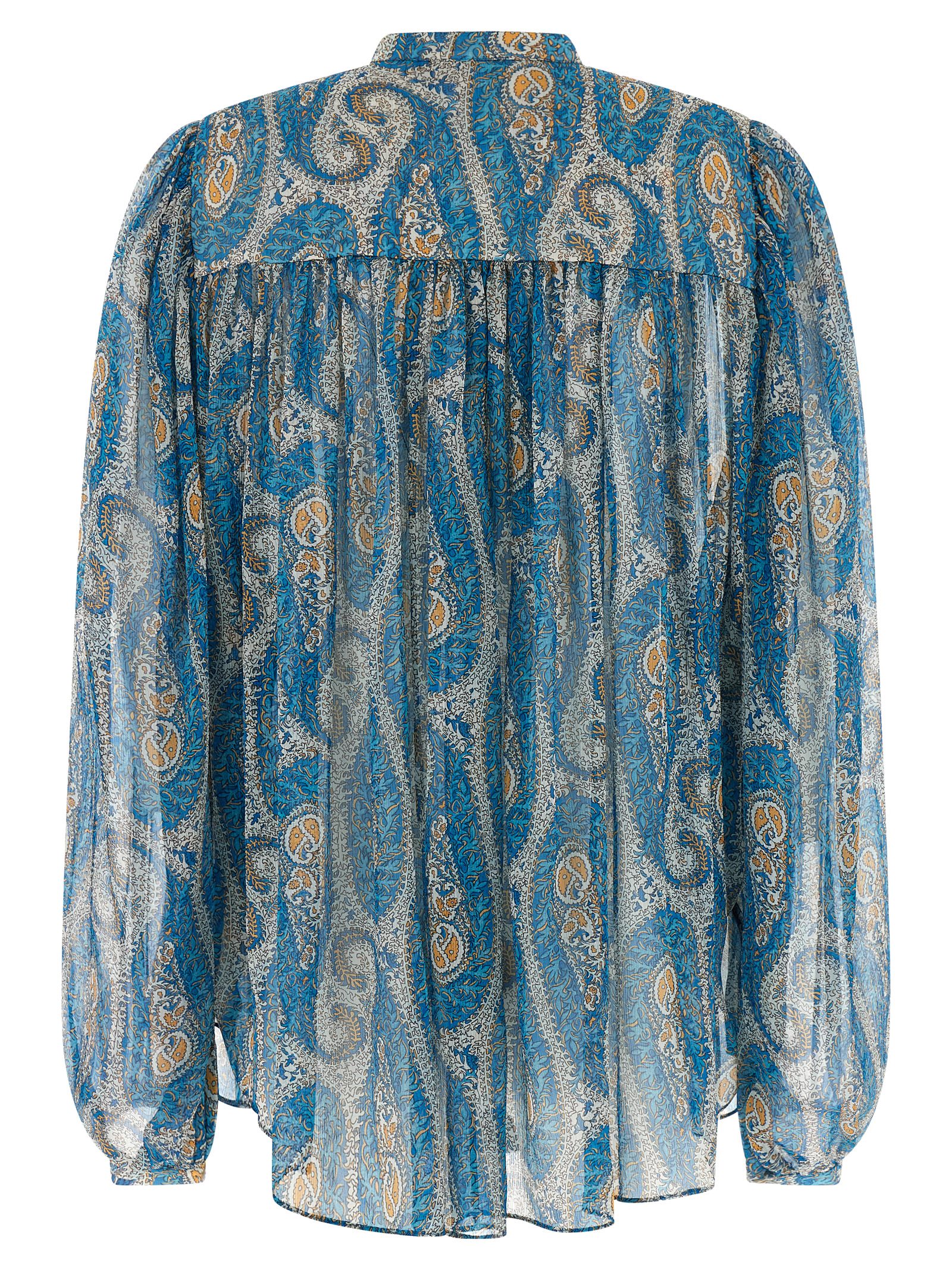 Patterned silk georgette shirt, crew neck, crinkled shoulders, front button closure, wide sleeves with cuffs, rounded hem.