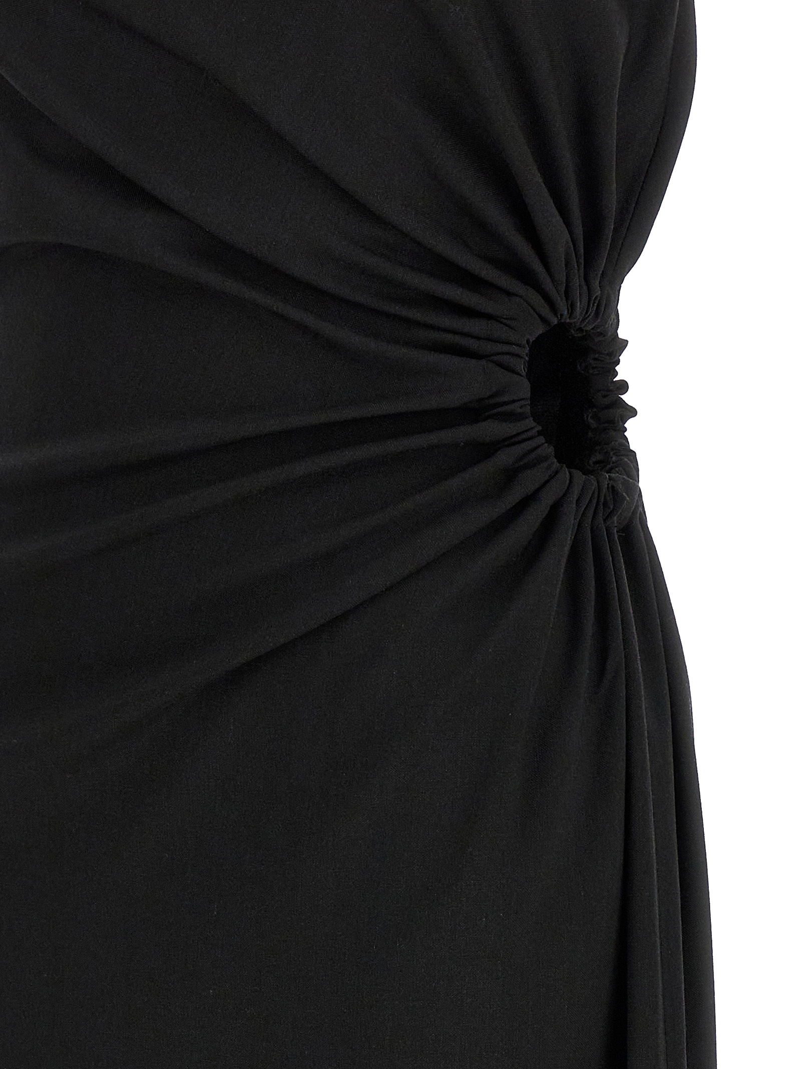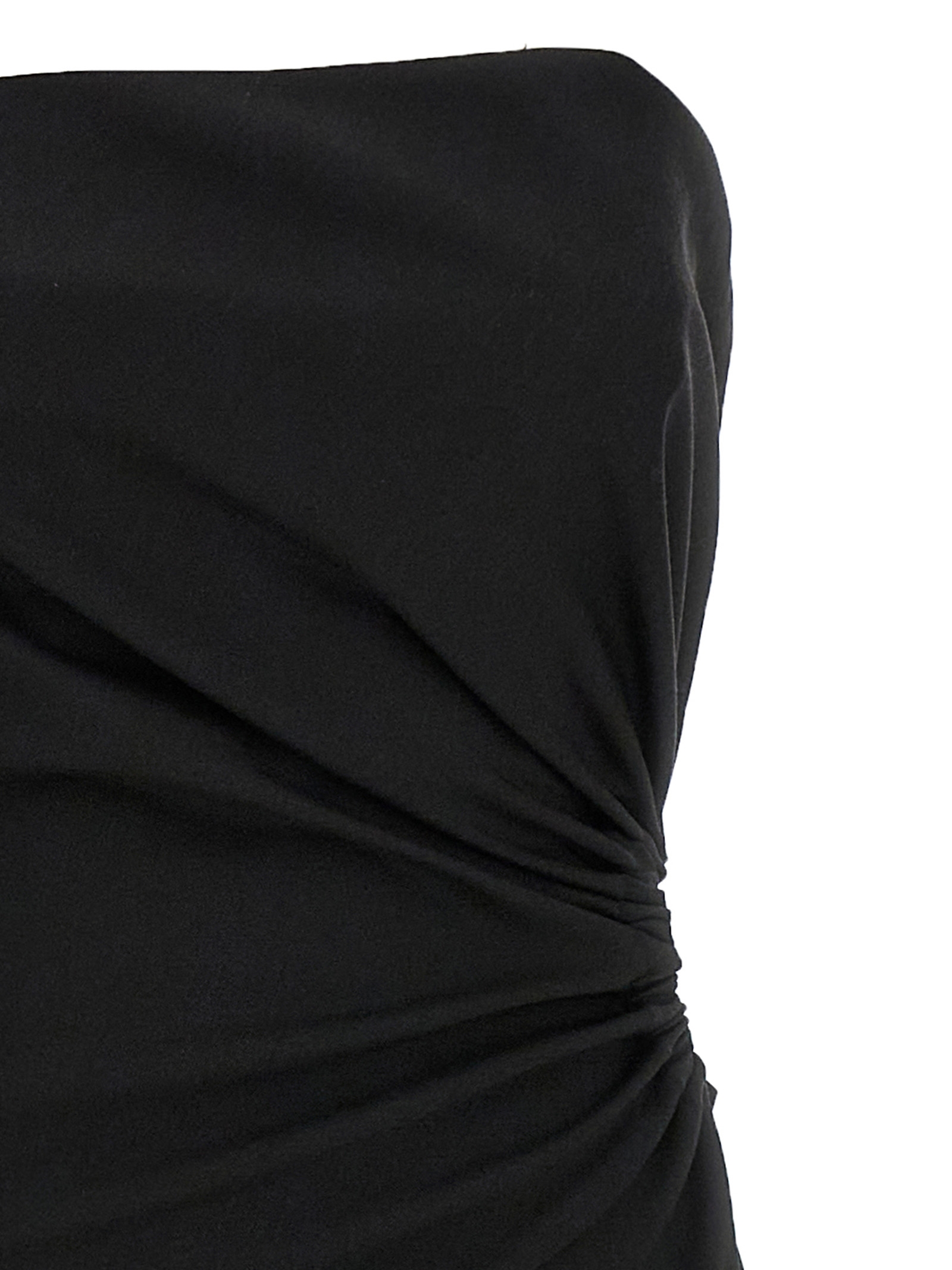 ‘Silva’ long dress in wool, mohair and silk canvas, off-the-shoulder bustier model, elastic cut-out detail curled and draped on the left side, split and side zip closure.