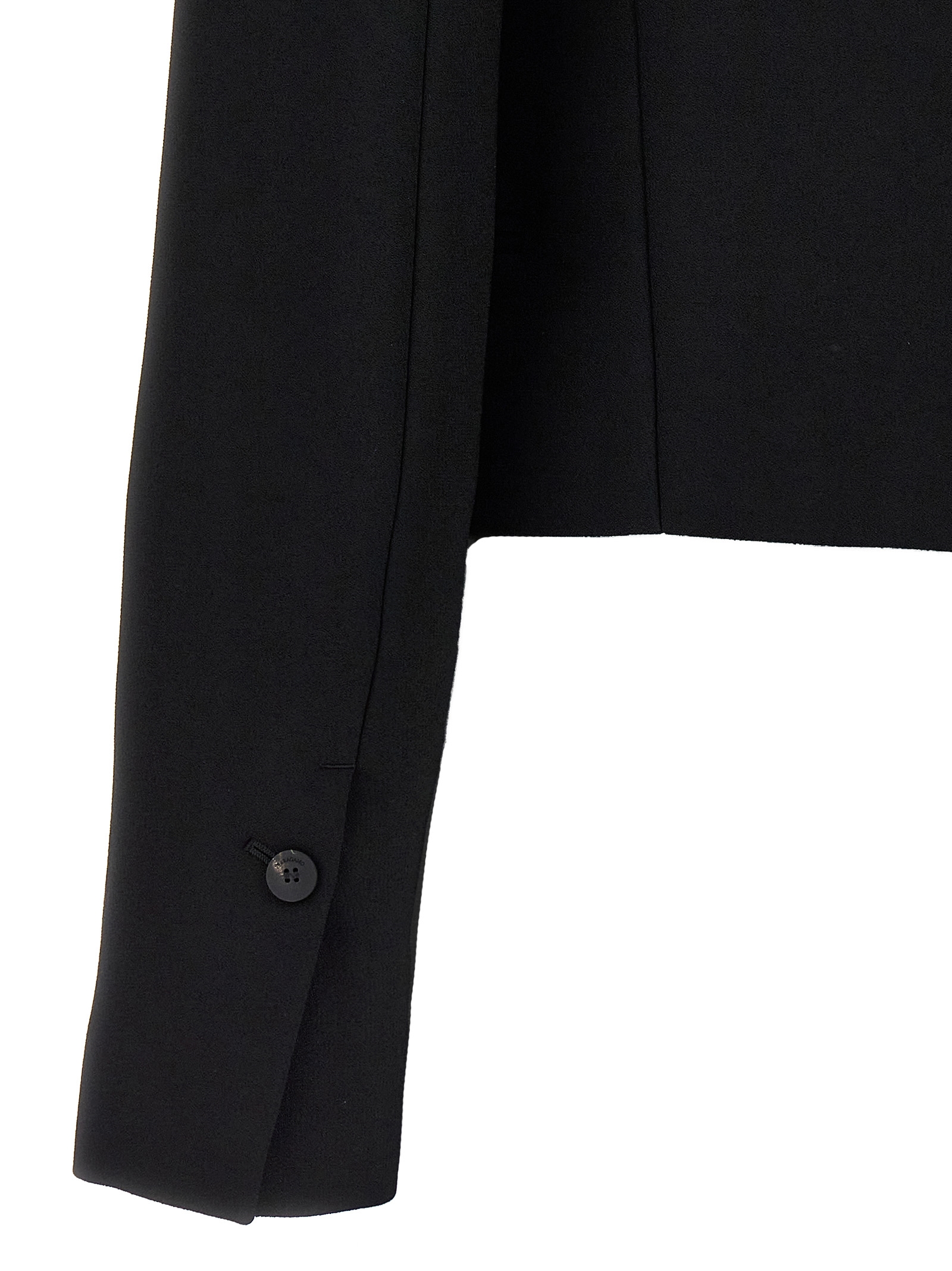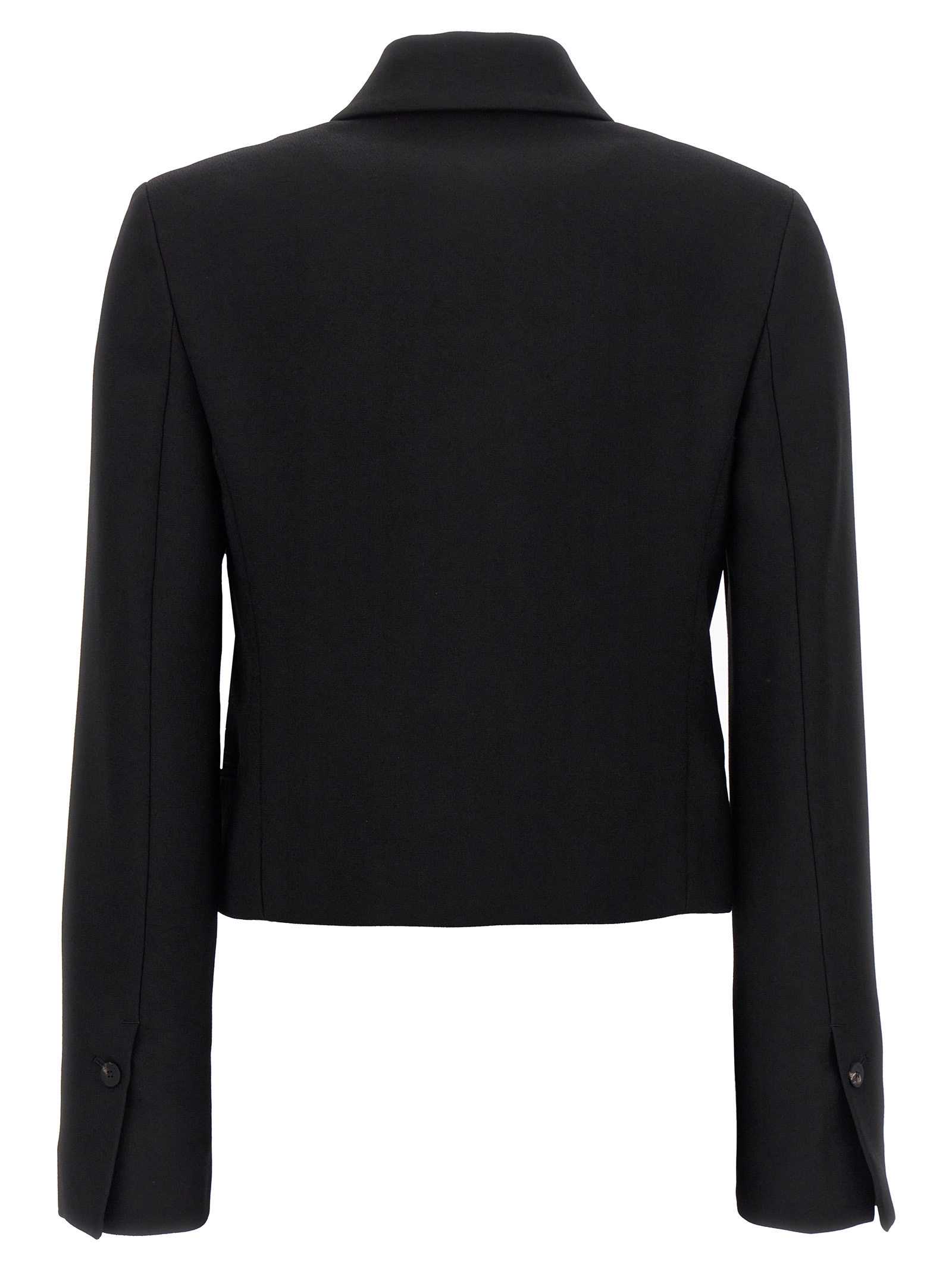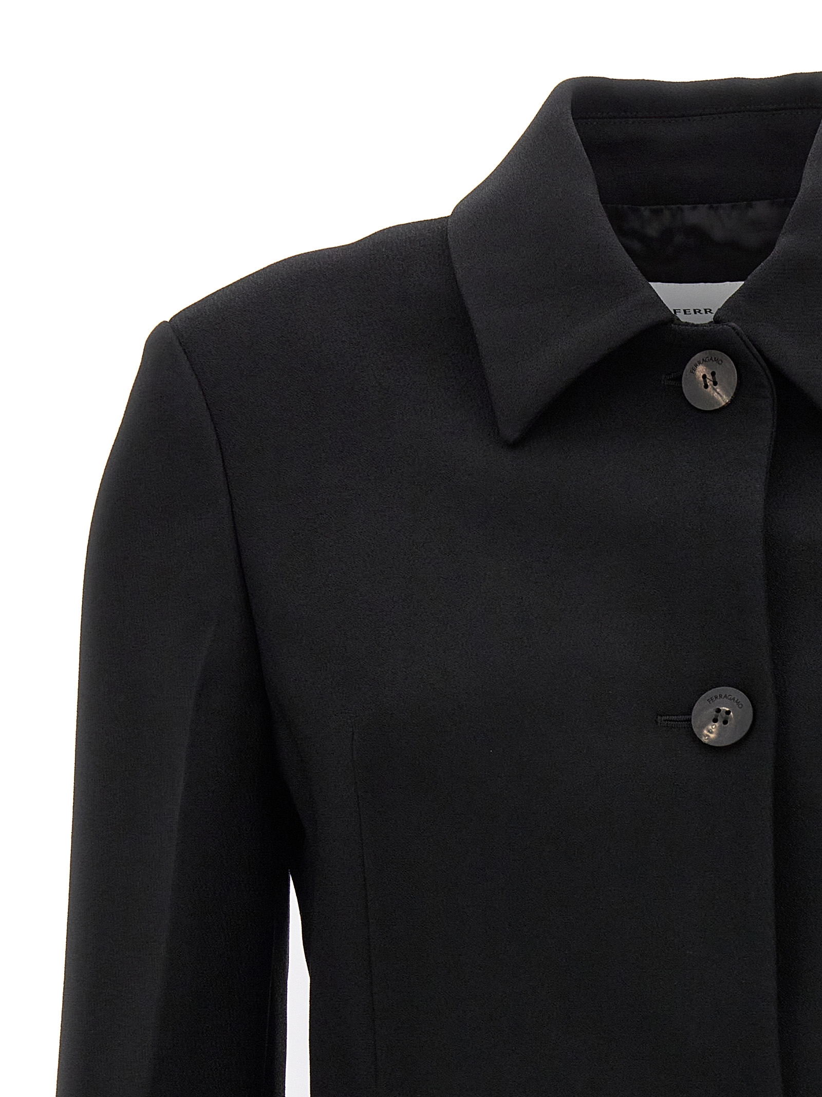 Single breasted viscose blend short jacket with button closure, shirt collar, pockets and long sleeves.