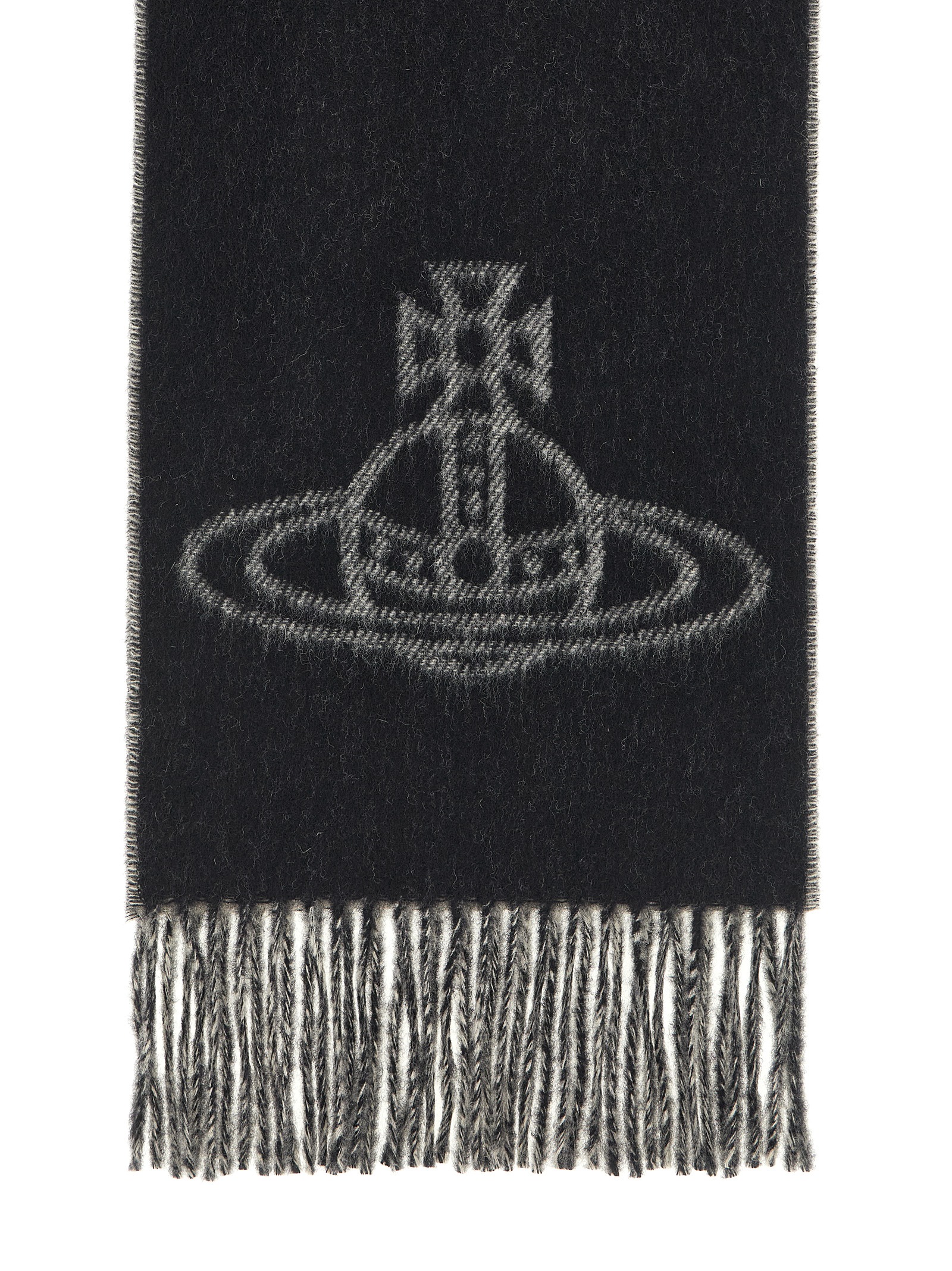 Single Orb Double’ fine-textured wool scarf with jacquard ‘Line Orb’ on both sides, double-sided model, fringed edges.