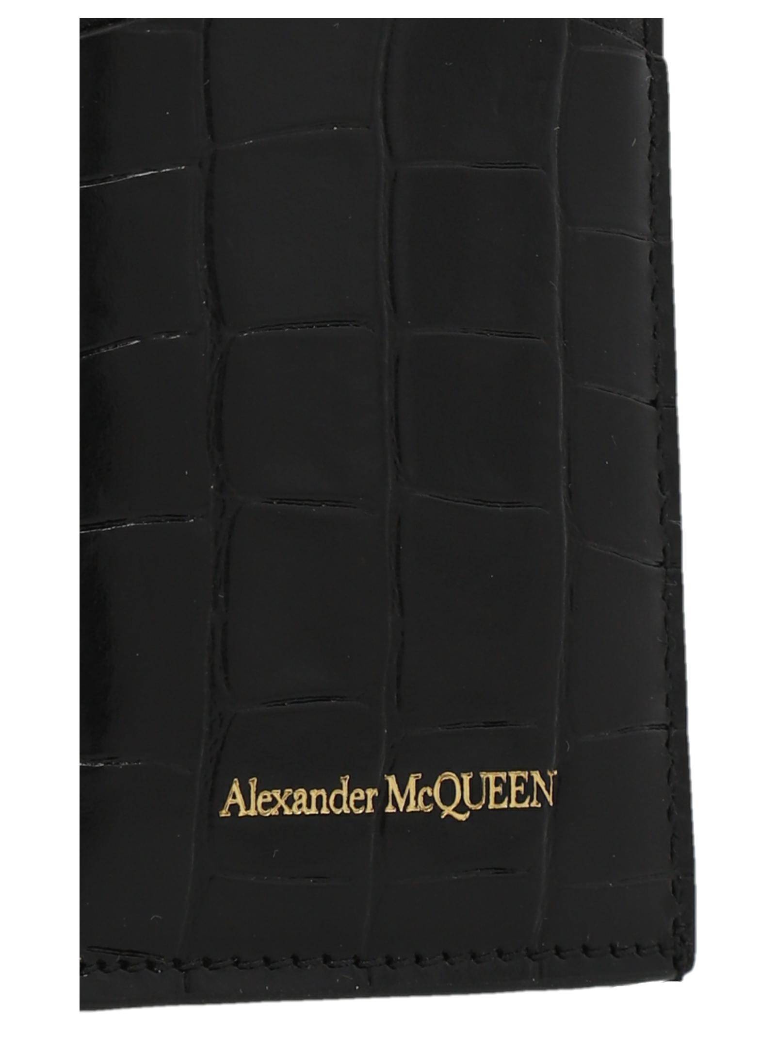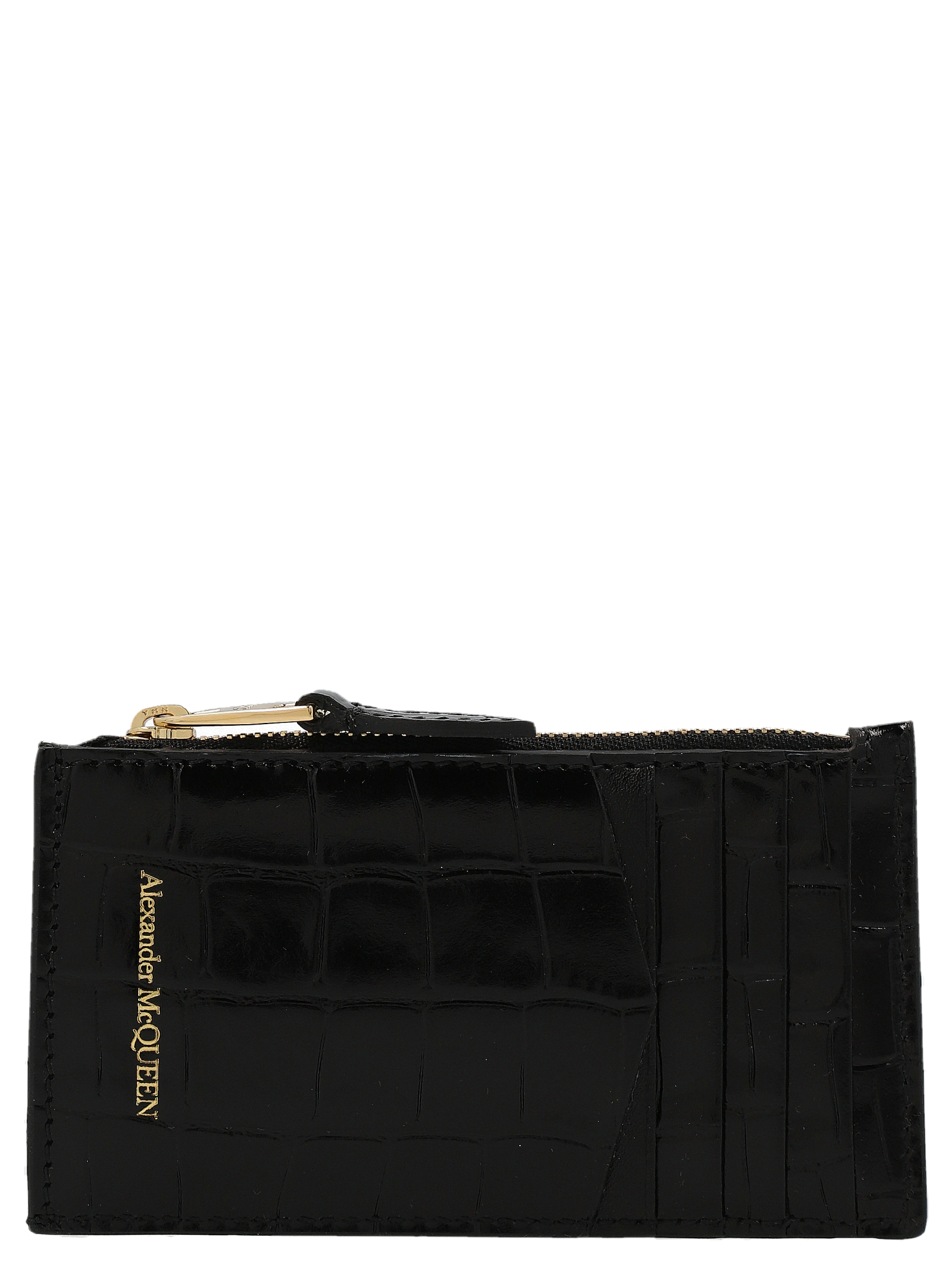 Shiny black crocodile-effect calf leather card holder with gold ‘Skull’ and five cracking credit cards, brass details with gold finish and an embossed logo.