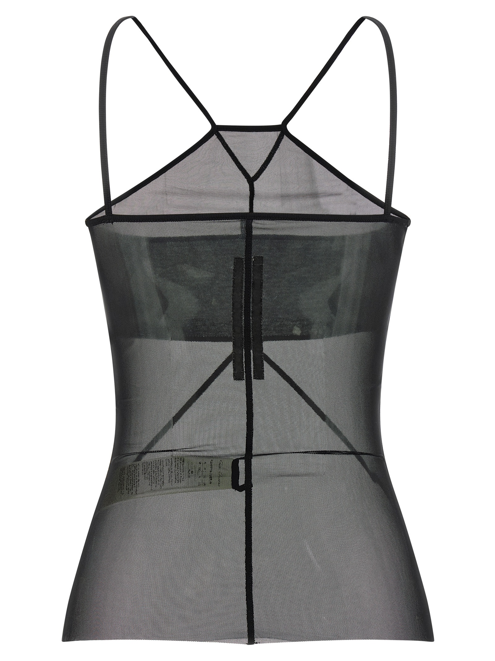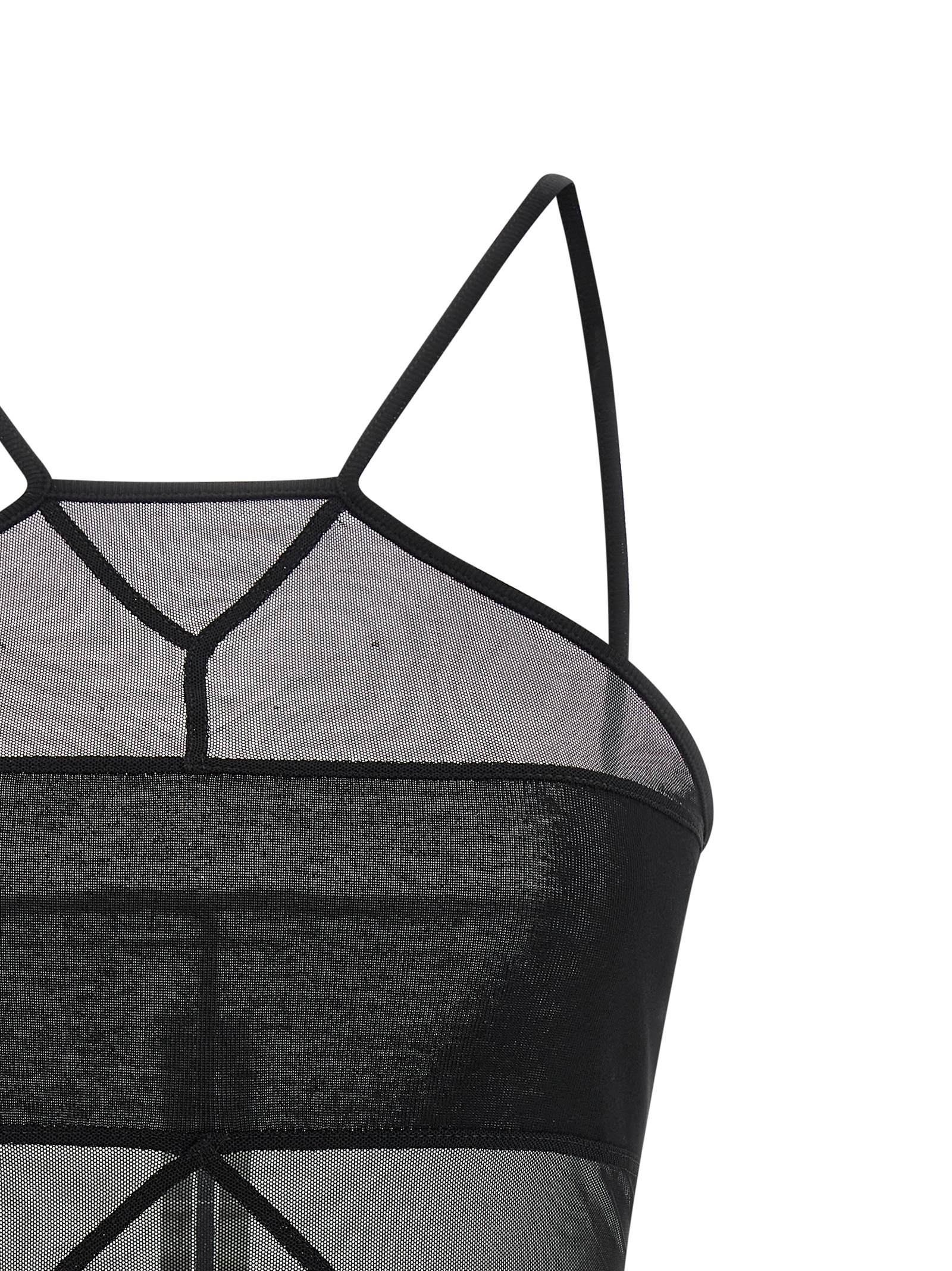 ‘SL Combo’ semi-transparent stretch tulle top with tone-on-tone ribbed cotton jersey center, American-style neckline with thin straps, and raw cut hem.