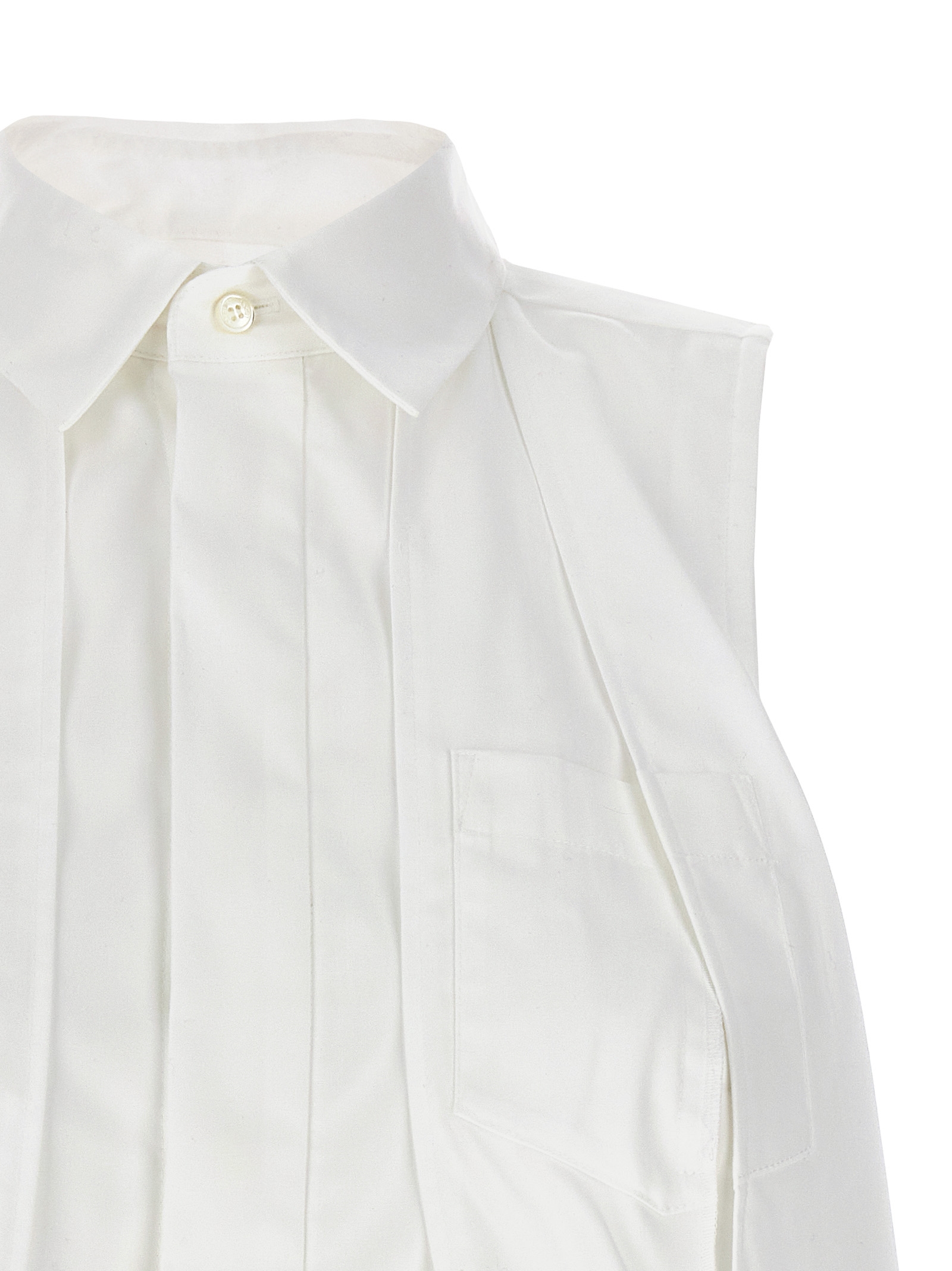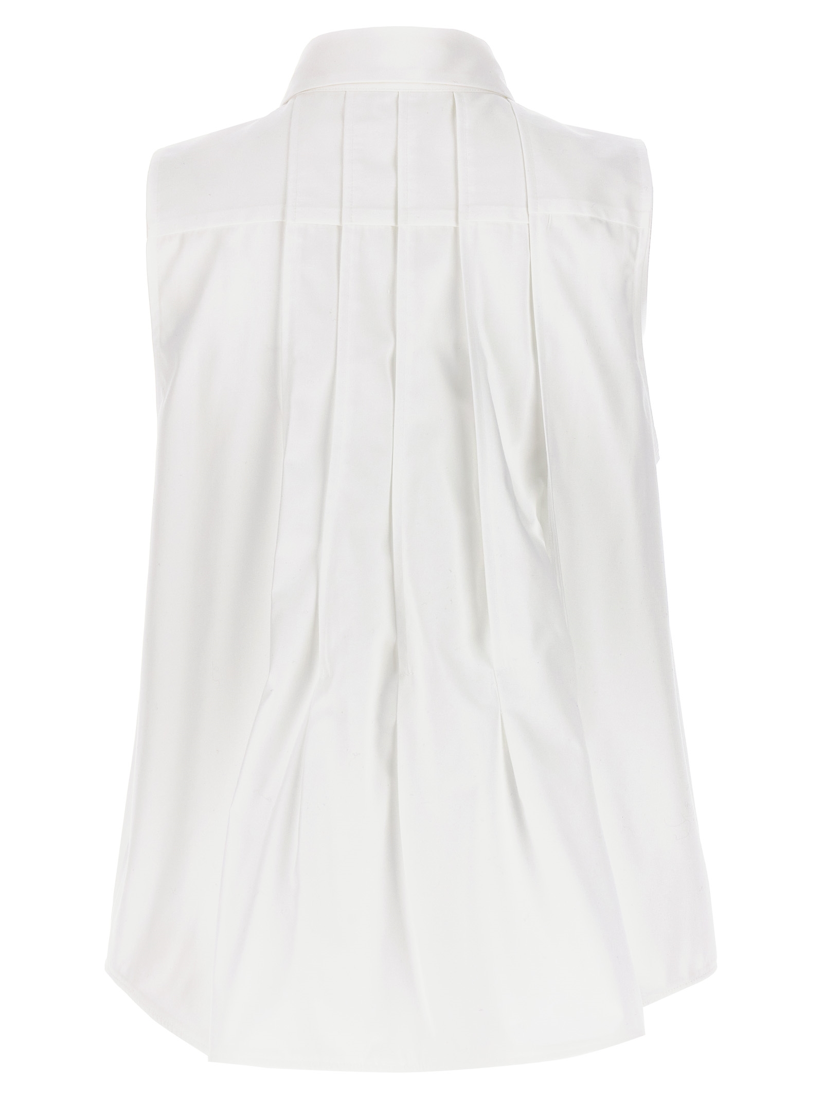 Sleeveless cotton shirt with collar, button closure and body pleats.