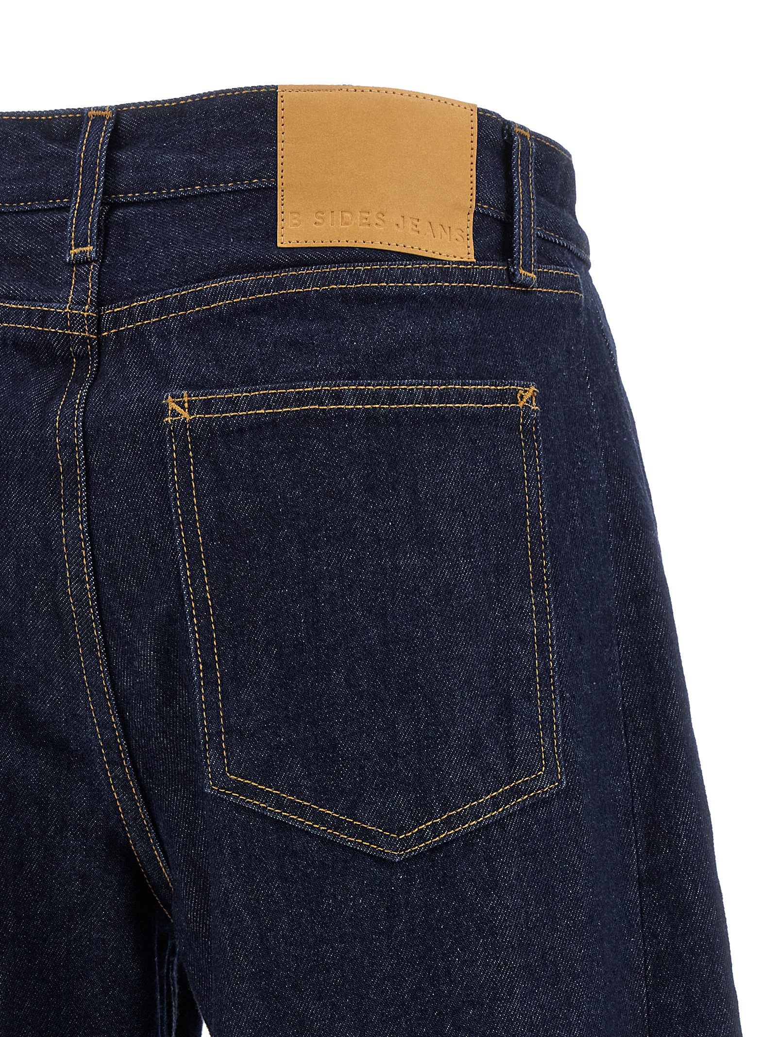 ‘Slim Lasso’ double-sided Japanese denim jeans with contrast stitching, slightly curved wide leg, side pin tucks, front button closure, five pockets, back logo tag.