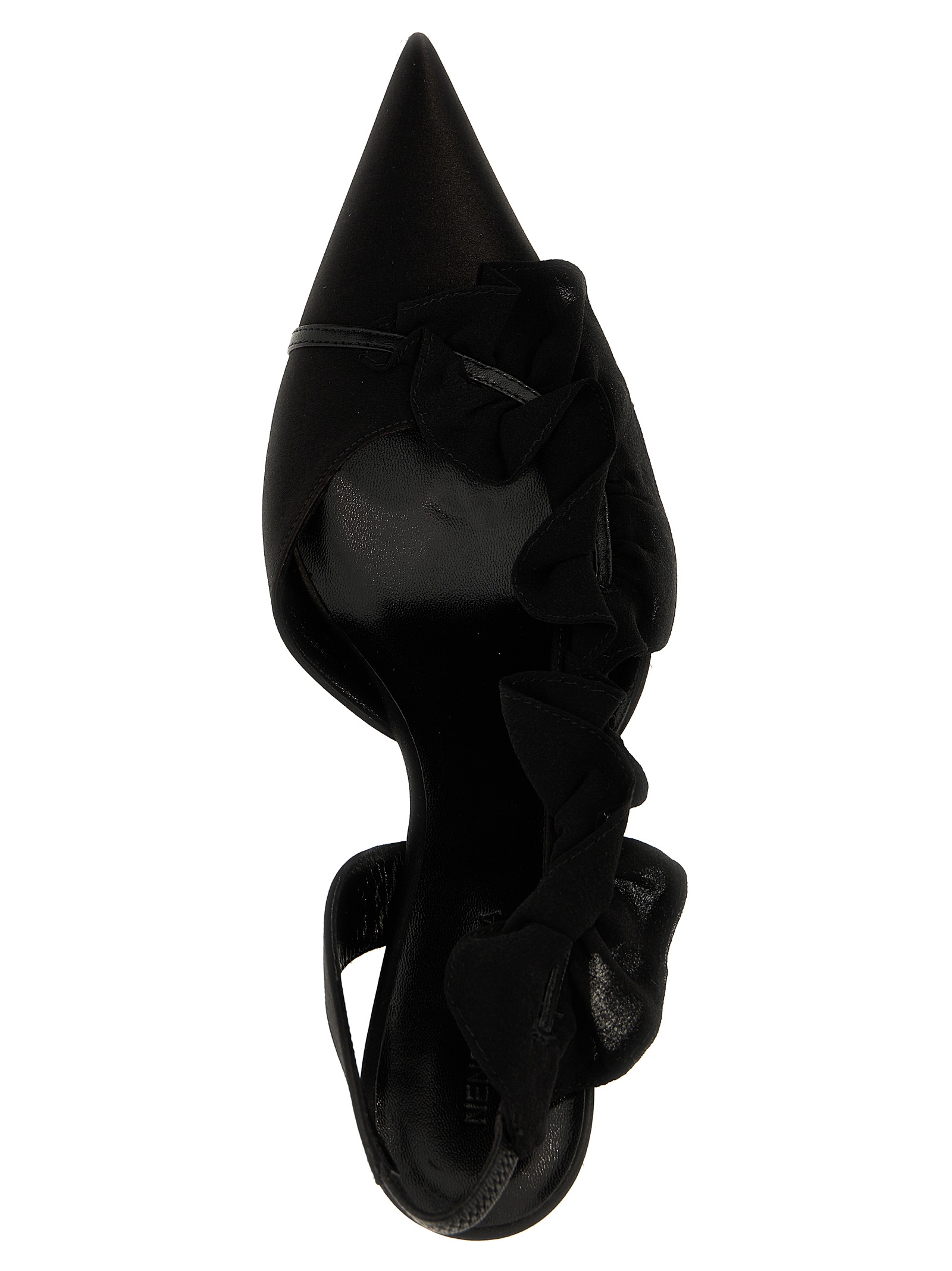 Leather and satin slingback with ruffle detail, and shaped heel.