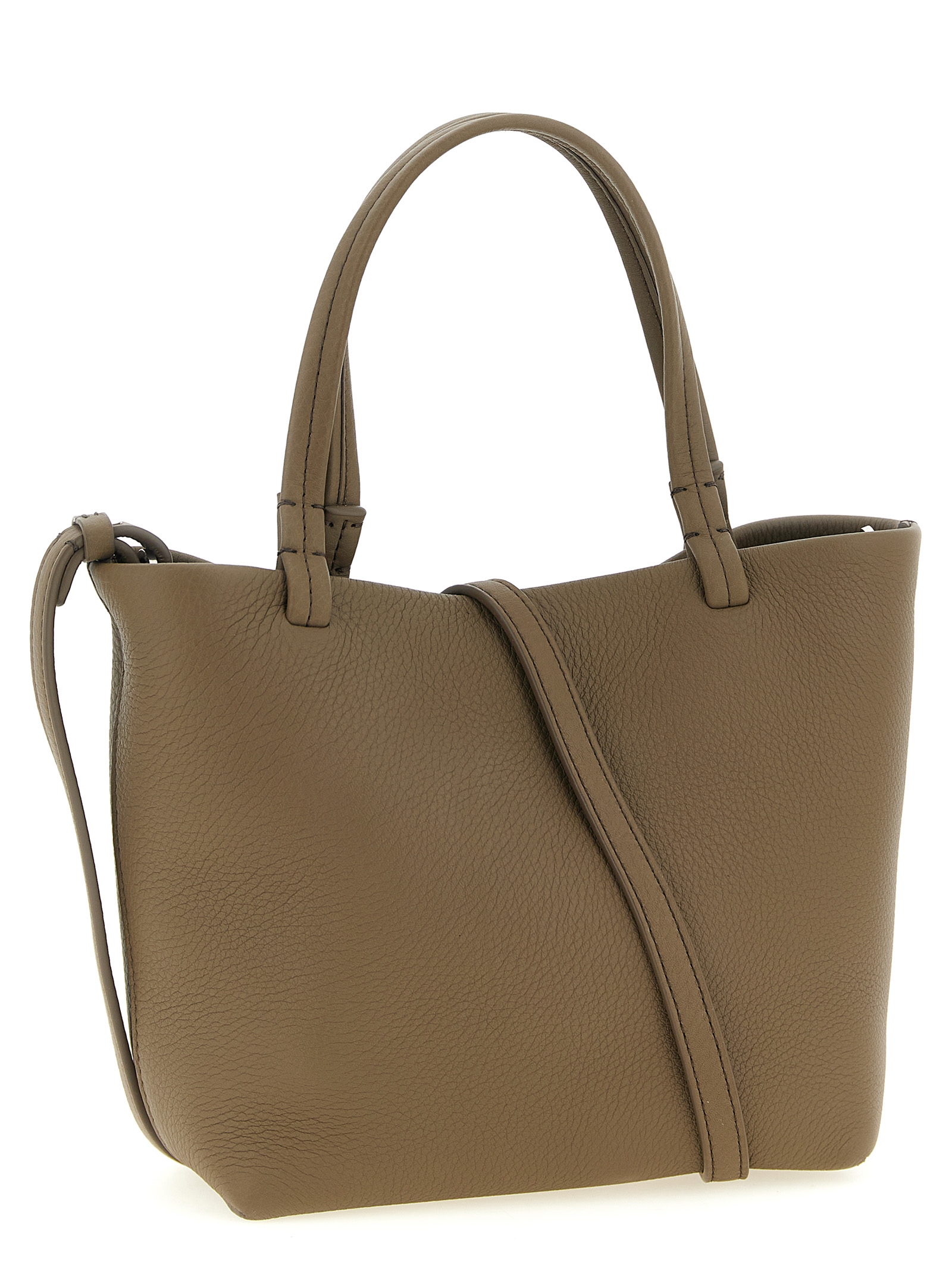 ‘Small Park’ hammered calf leather shopping bag with front embossed logo, double fixed handle, inner frog closure, removable shoulder strap.