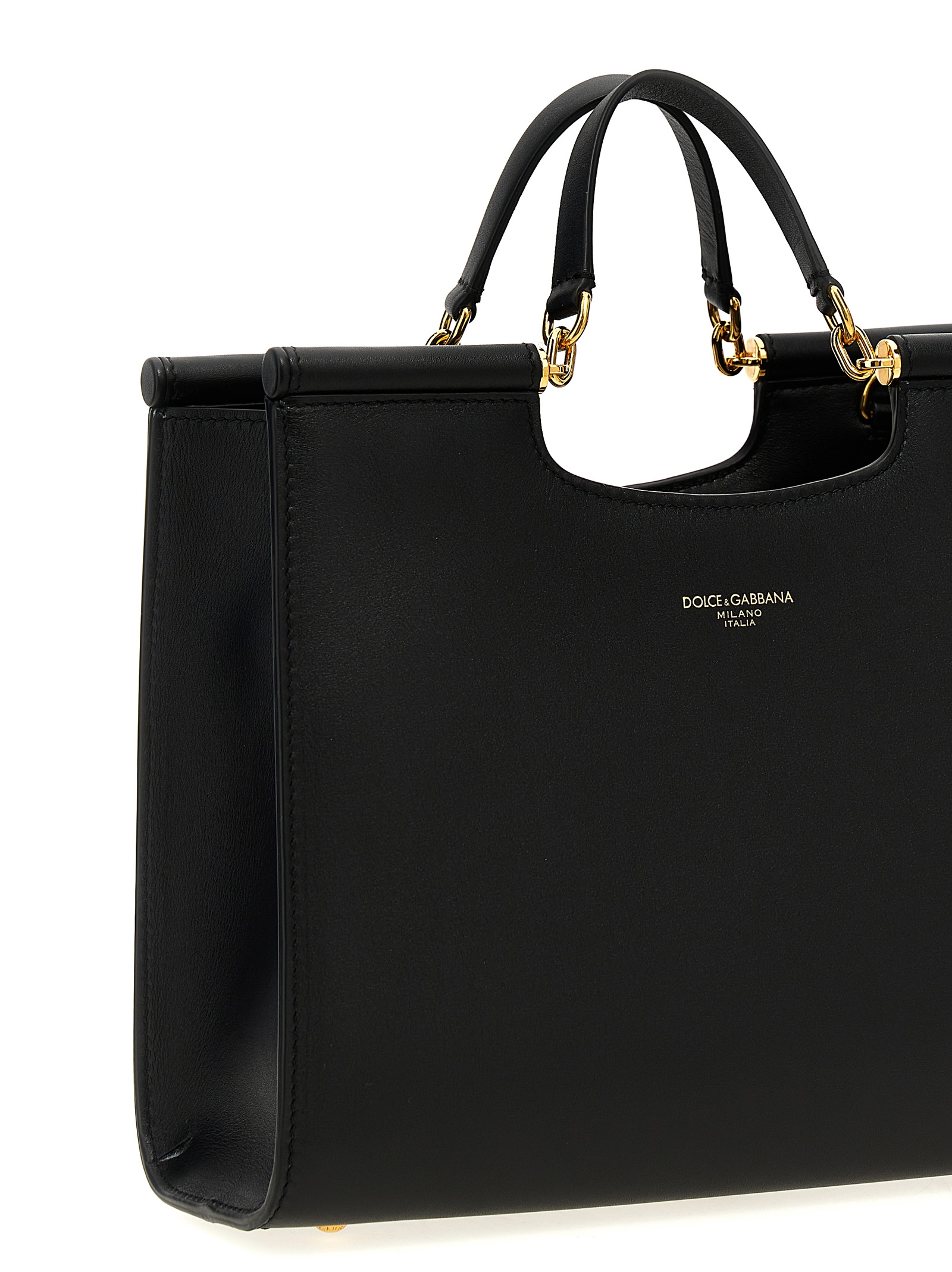 Small ‘Sicily’ leather shopping bag, double fixed handle, front embossed logo, gold metal details, adjustable and removable shoulder strap.