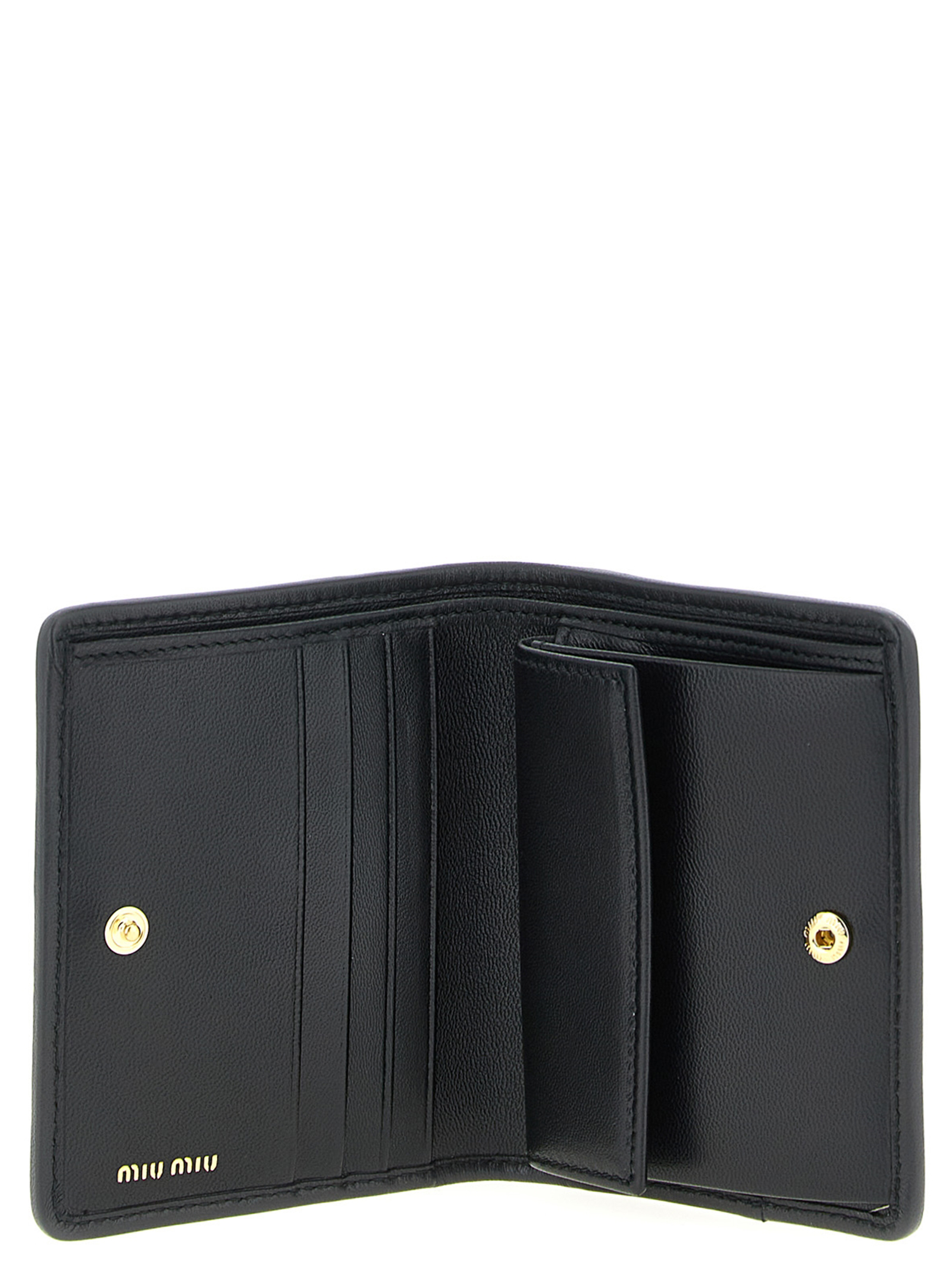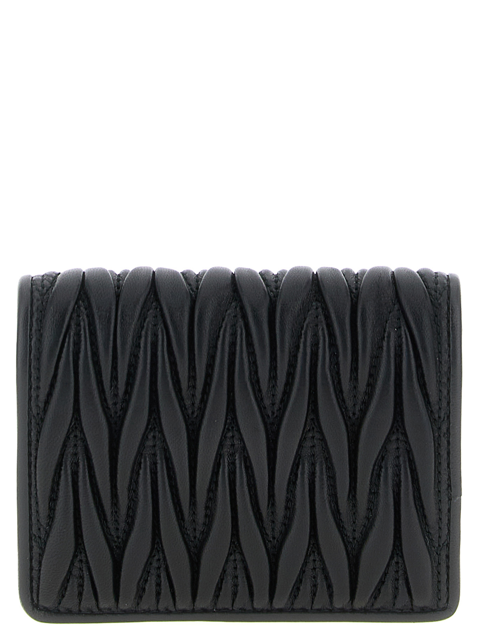 Small wallet in matelassé nappa leather, front metal lettering logo, snap button closure, moiré lining.