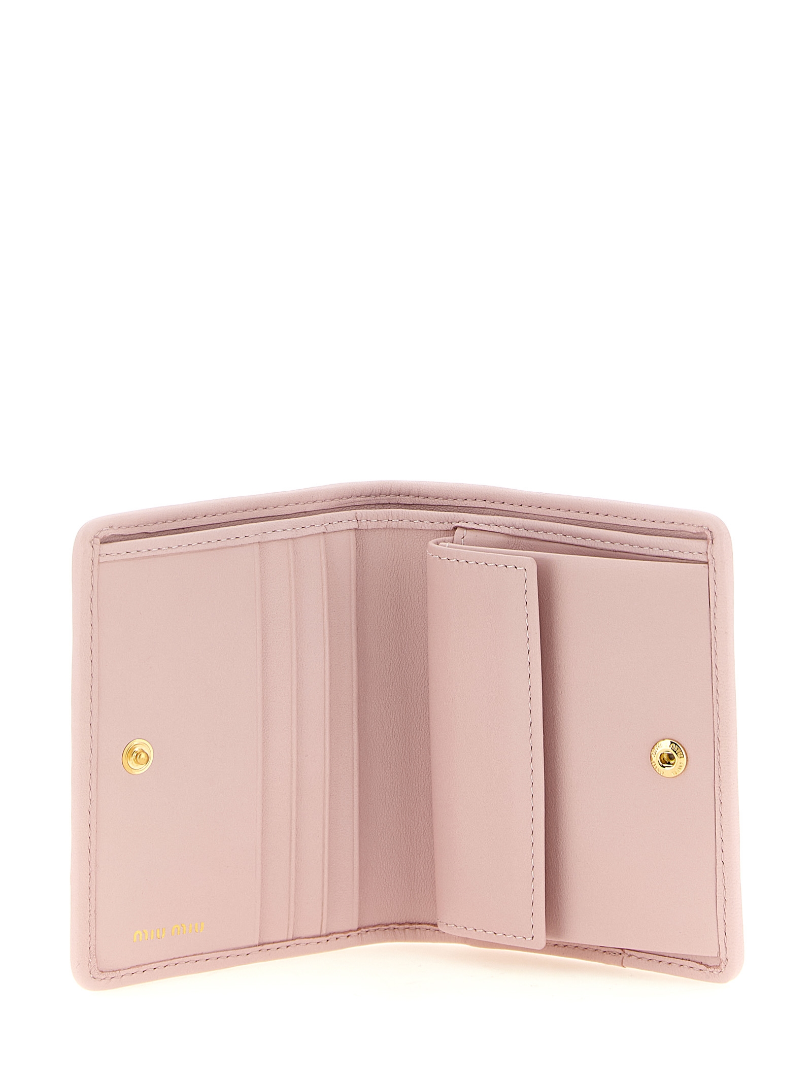 Small wallet in matelassé nappa leather, front metal lettering logo, snap button closure, moiré lining.
