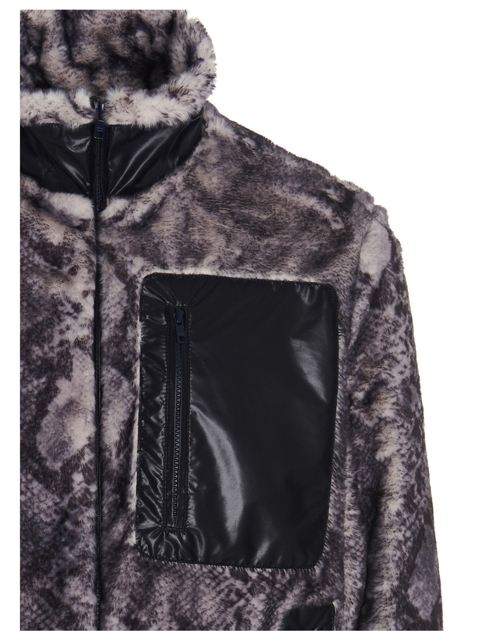 Synthetic fur coat with a zip closure, a nylon patch pocket and contrasting blue nylon details.