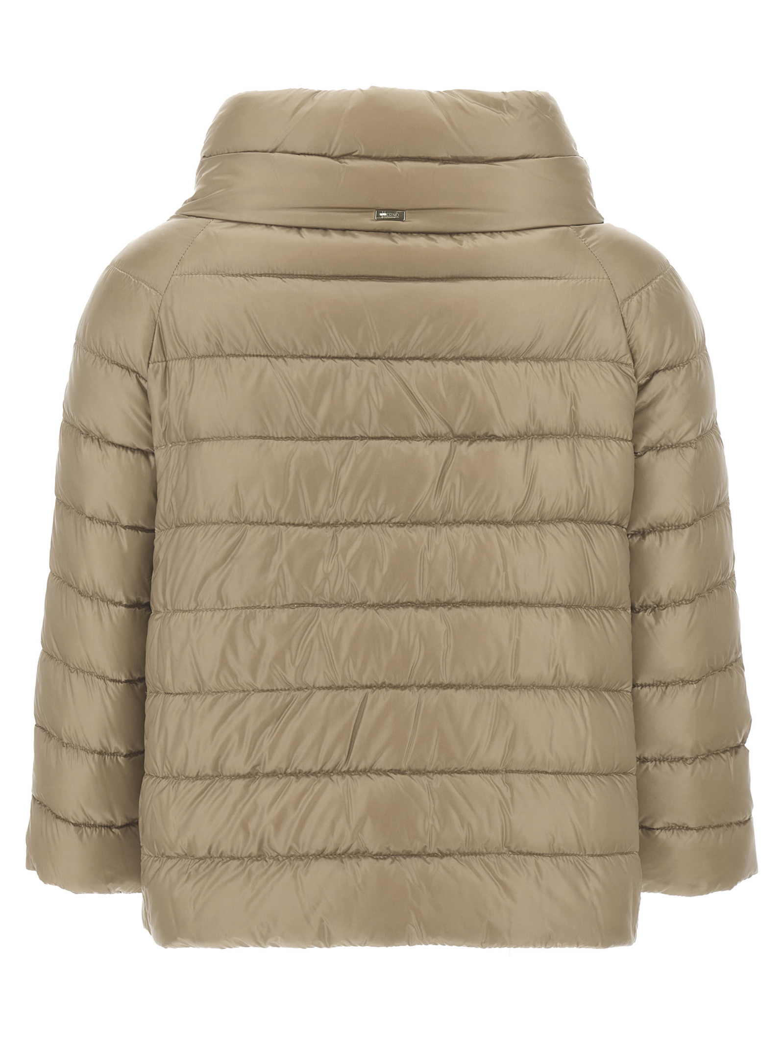 ‘Sofia’ quilted nylon down jacket slightly padded with goose down, crop model, wide high neck, front snap button closure, pockets, 3/4 sleeves.