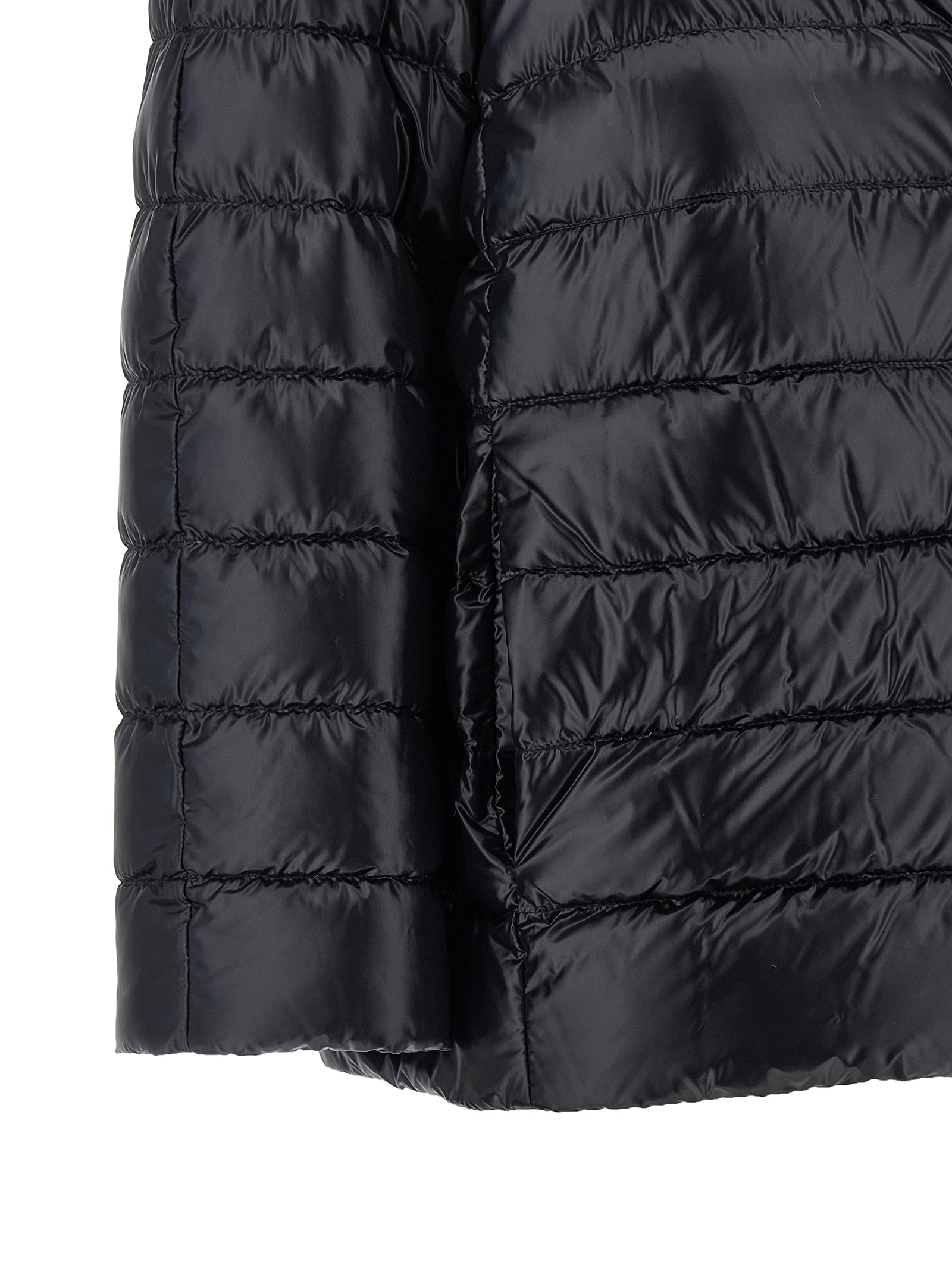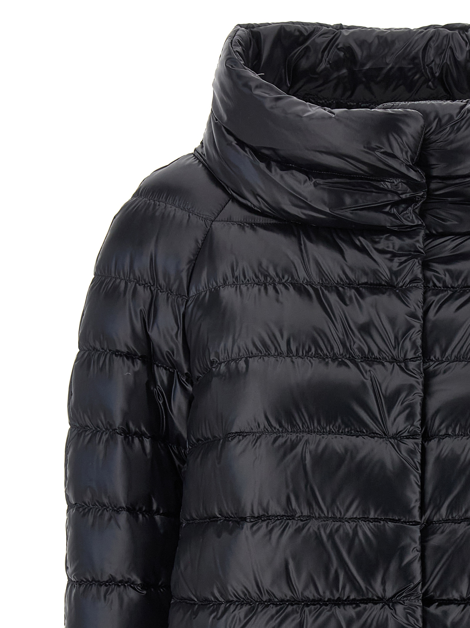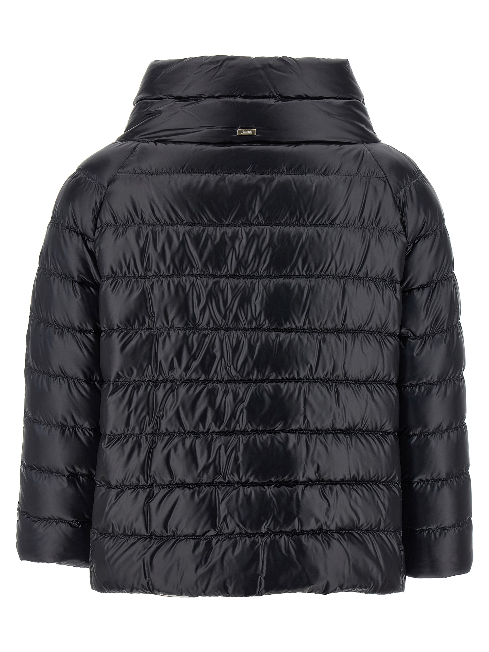 ‘Sofia’ quilted nylon down jacket slightly padded with goose down, crop model, wide high neck, front snap button closure, pockets, 3/4 sleeves.
