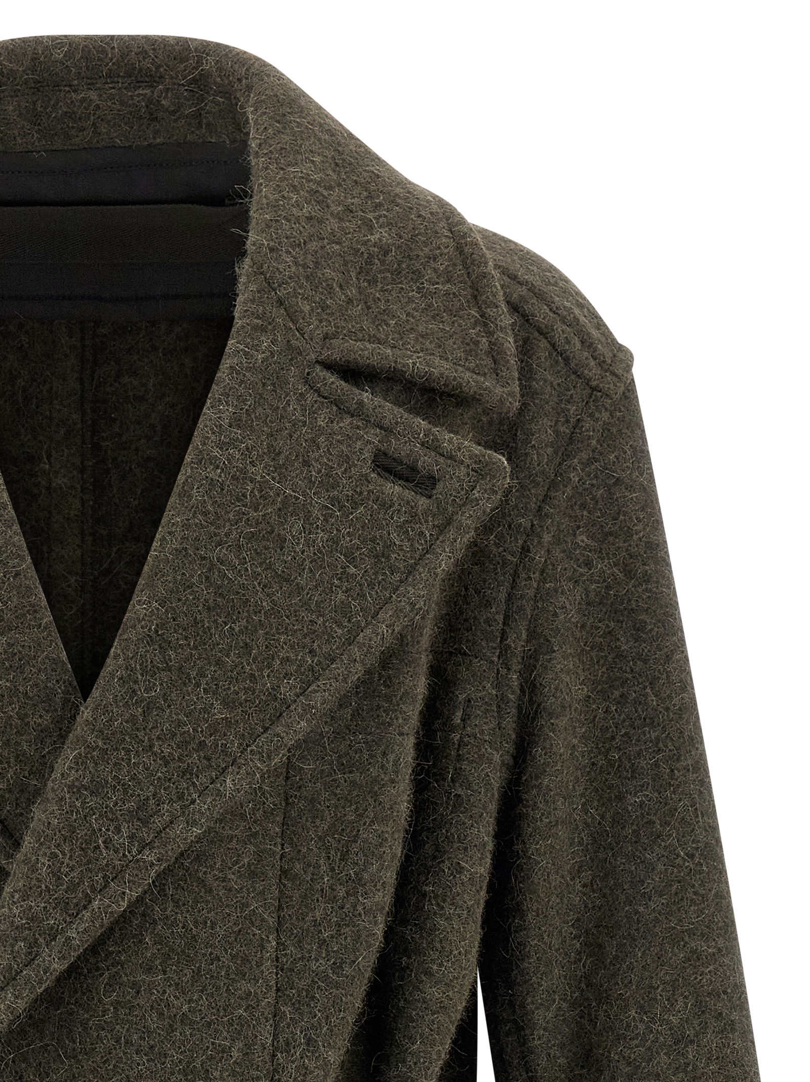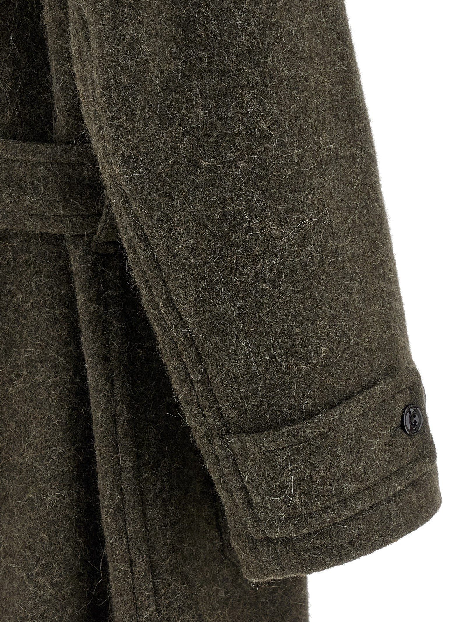 ‘Soft’ double-breasted wool and alpaca blend coat with front button closure, lapel collar with underneck, patch pocket, long sleeves with dropped shoulder, back split, unlined, removable belt.