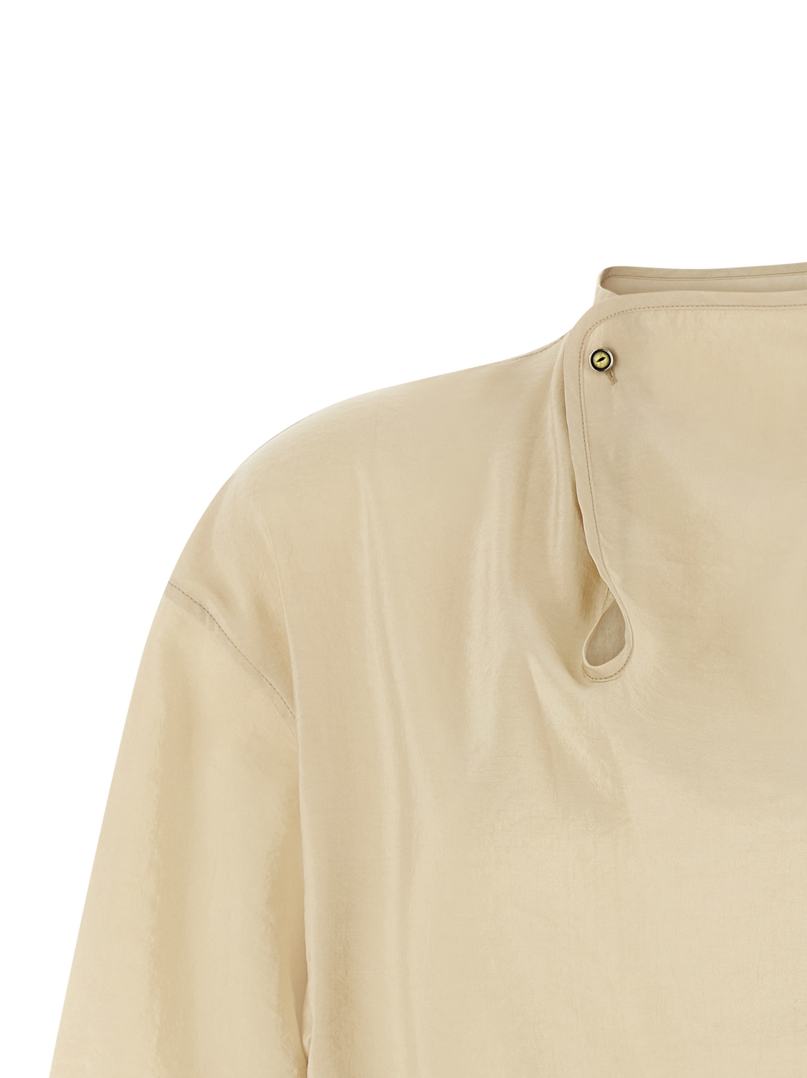 ‘Soft Collar’ slightly ruffled ‘dry’ silk blend top, neckline with asymmetric closure with jewel button, straight fit, three-quarter wide sleeves.
