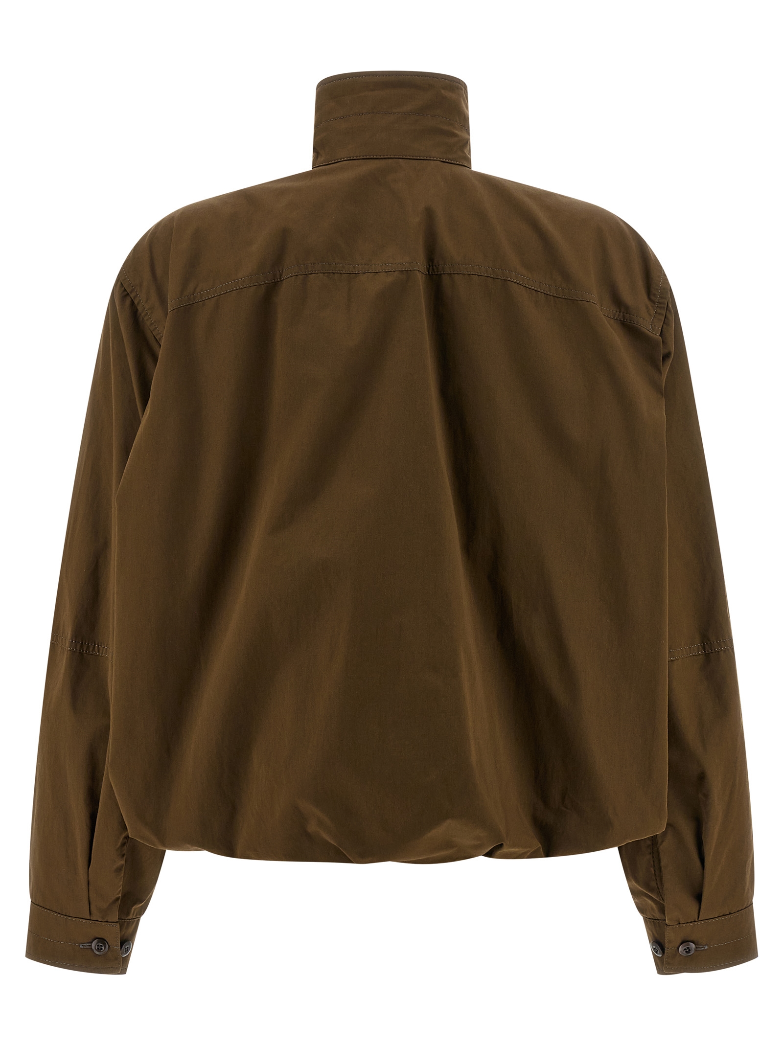 ‘Soft Pleated’ pleated jacket in lightweight cotton satin with front draped effect, structured silhouette with curled hem on the hem, high neck with buttons, hidden front button closure, pockets, long cuffed sleeves.