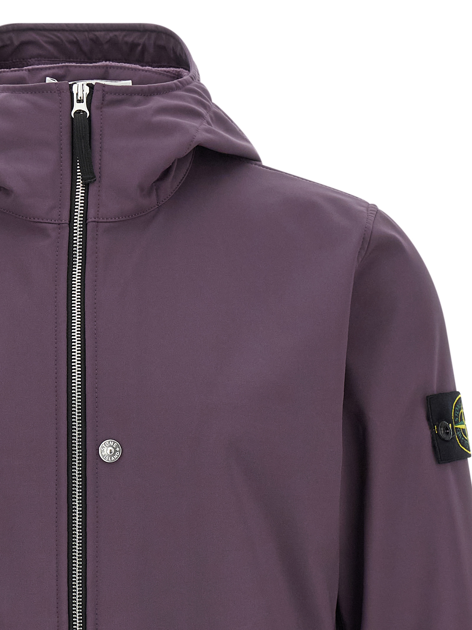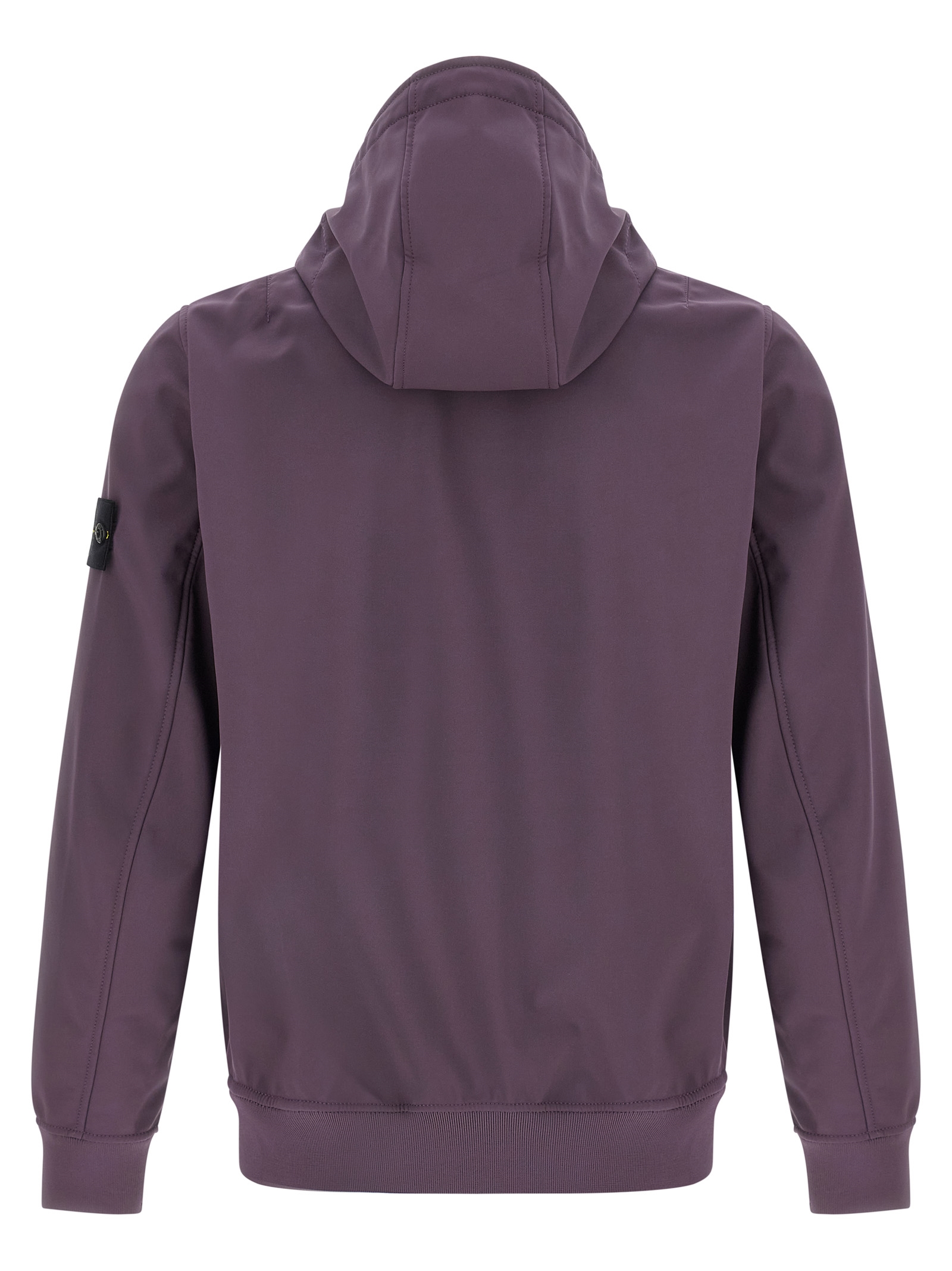 ‘Soft Shell-R e.dye® Technology’ stretch polyester canvas jacket woven with e.dye® Waterless Color System™ technology yarns, fleece lining, hood, front zip closure, pockets, long cuffed sleeves and logo badge.