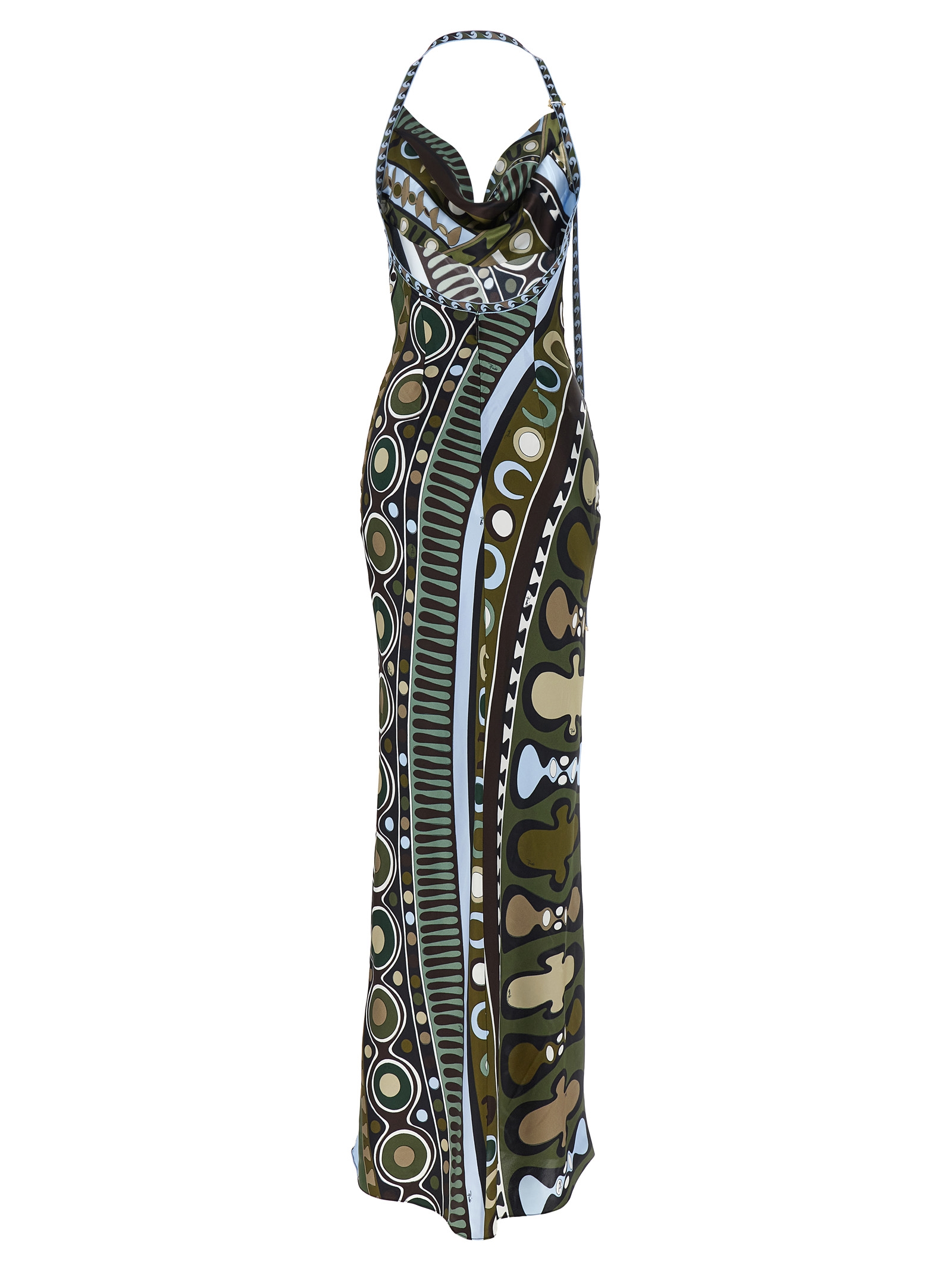 Long dress in ‘Soleil’ print satin, American neckline with soft front draping and adjustable grosgrain ribbon piping, bare back, sleeveless, flared silhouette, back zip closure.