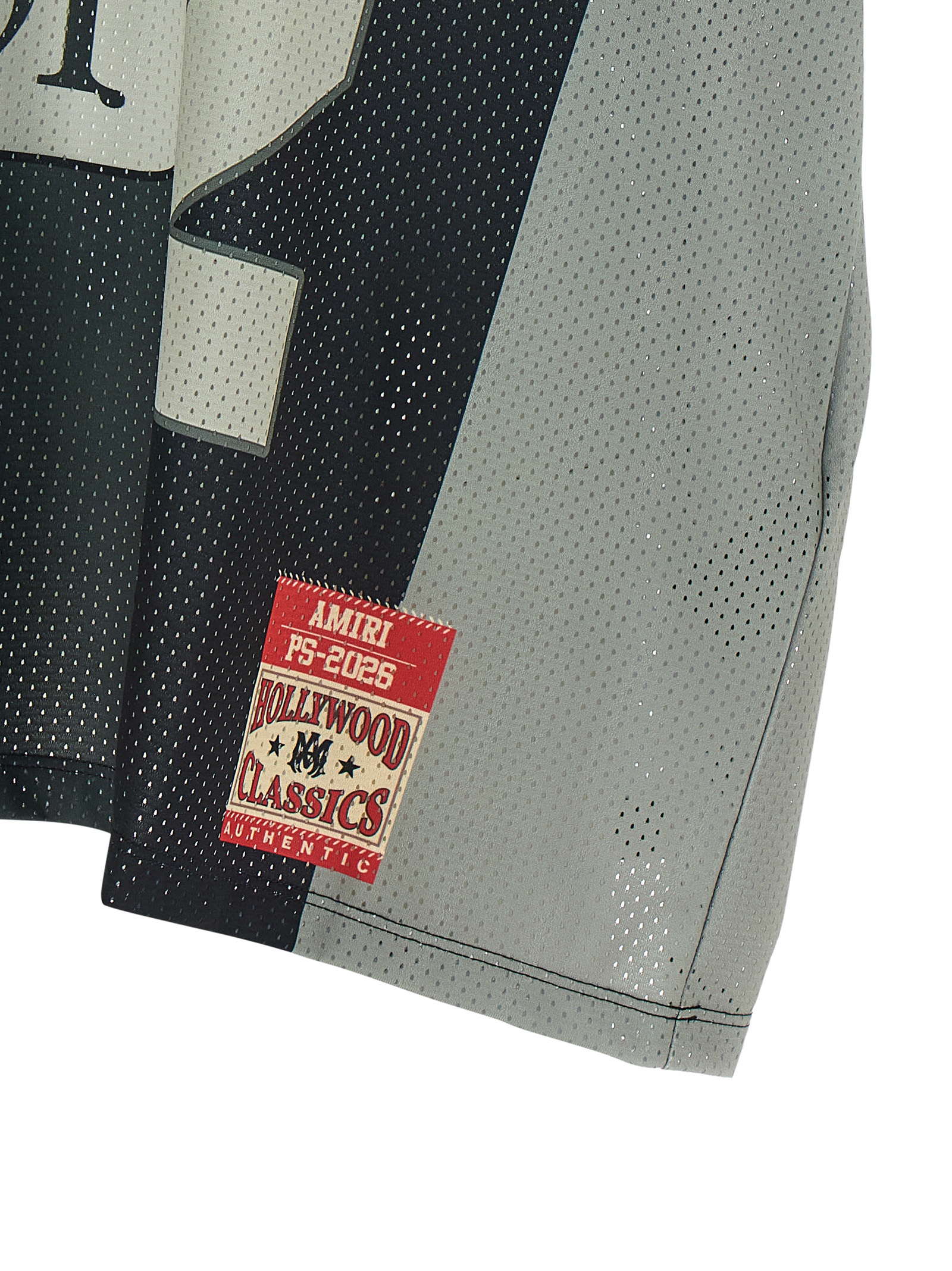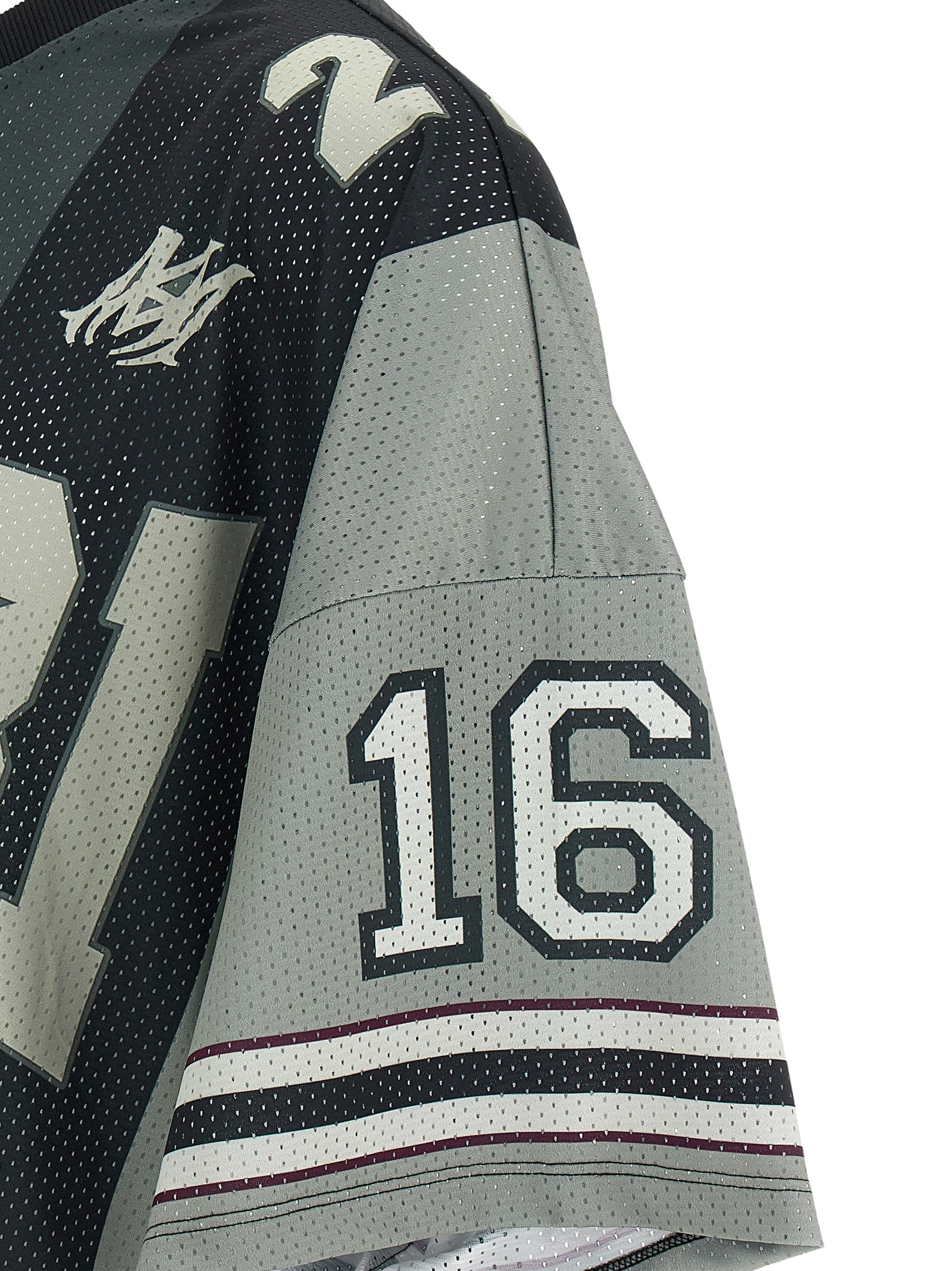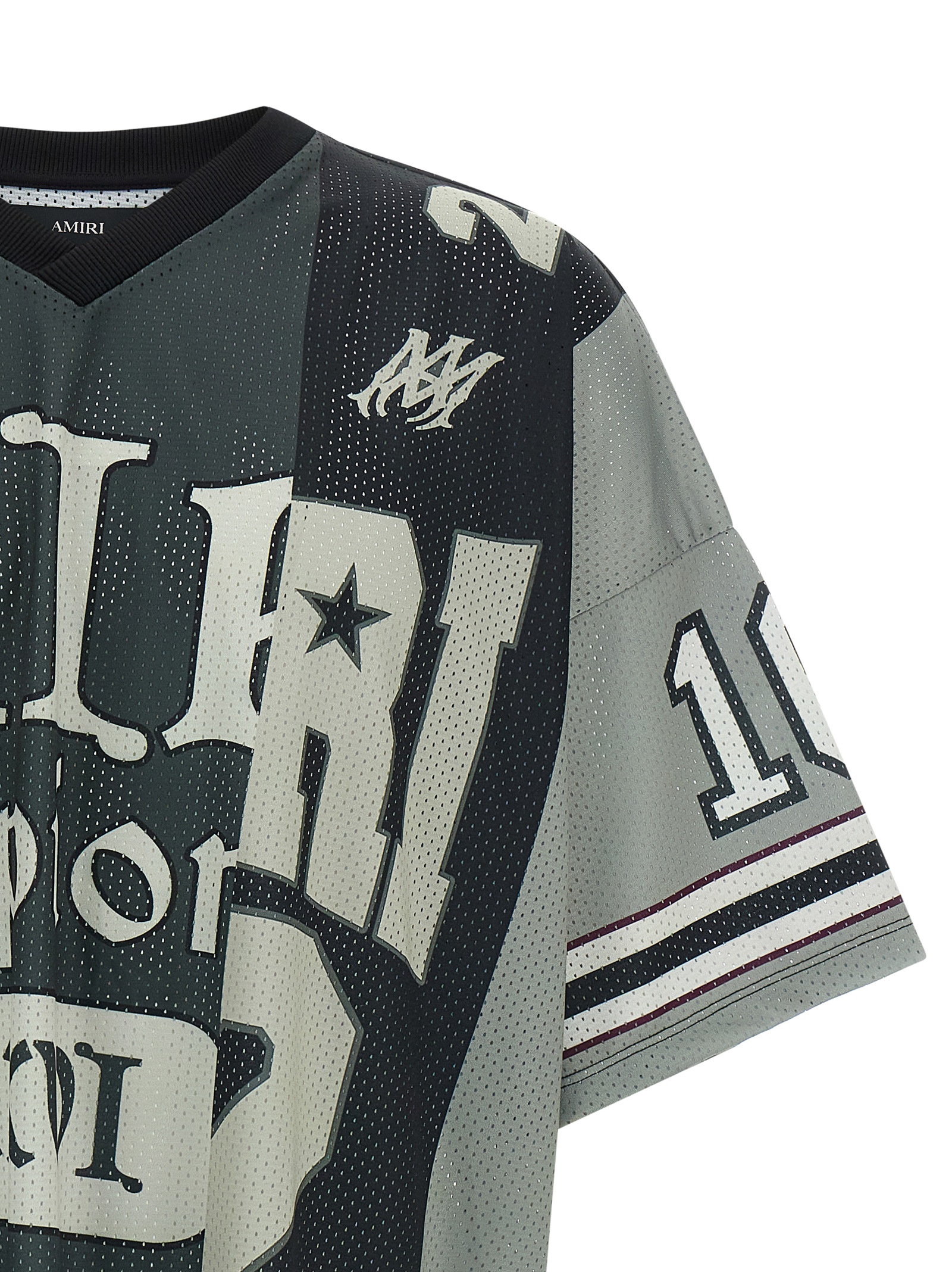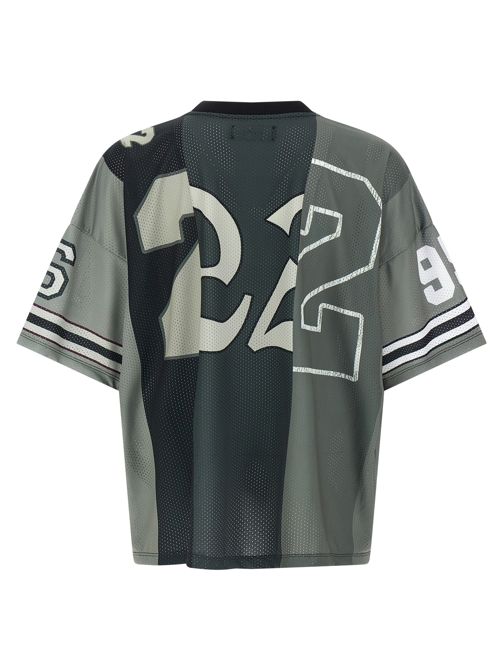 ‘Spliced’ mesh T-shirt, patchwork construction with all-over graphic print, V-neck, short sleeves with dropped shoulders.