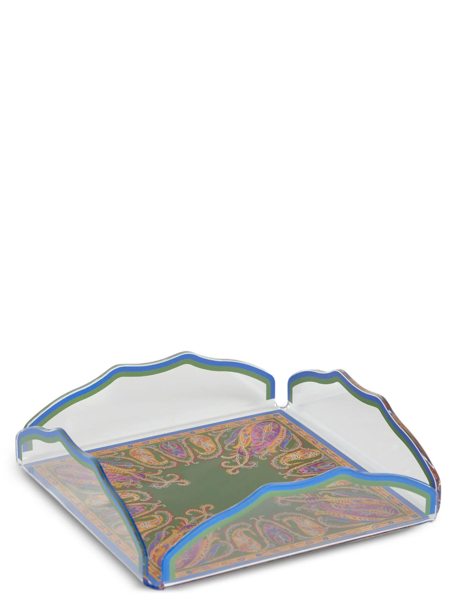 Square acrylic crystal tray, raised edges with wavy profile, base with Paisley pattern.