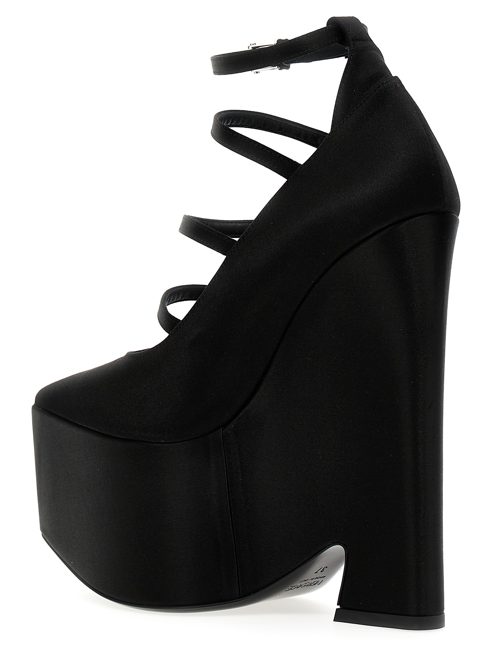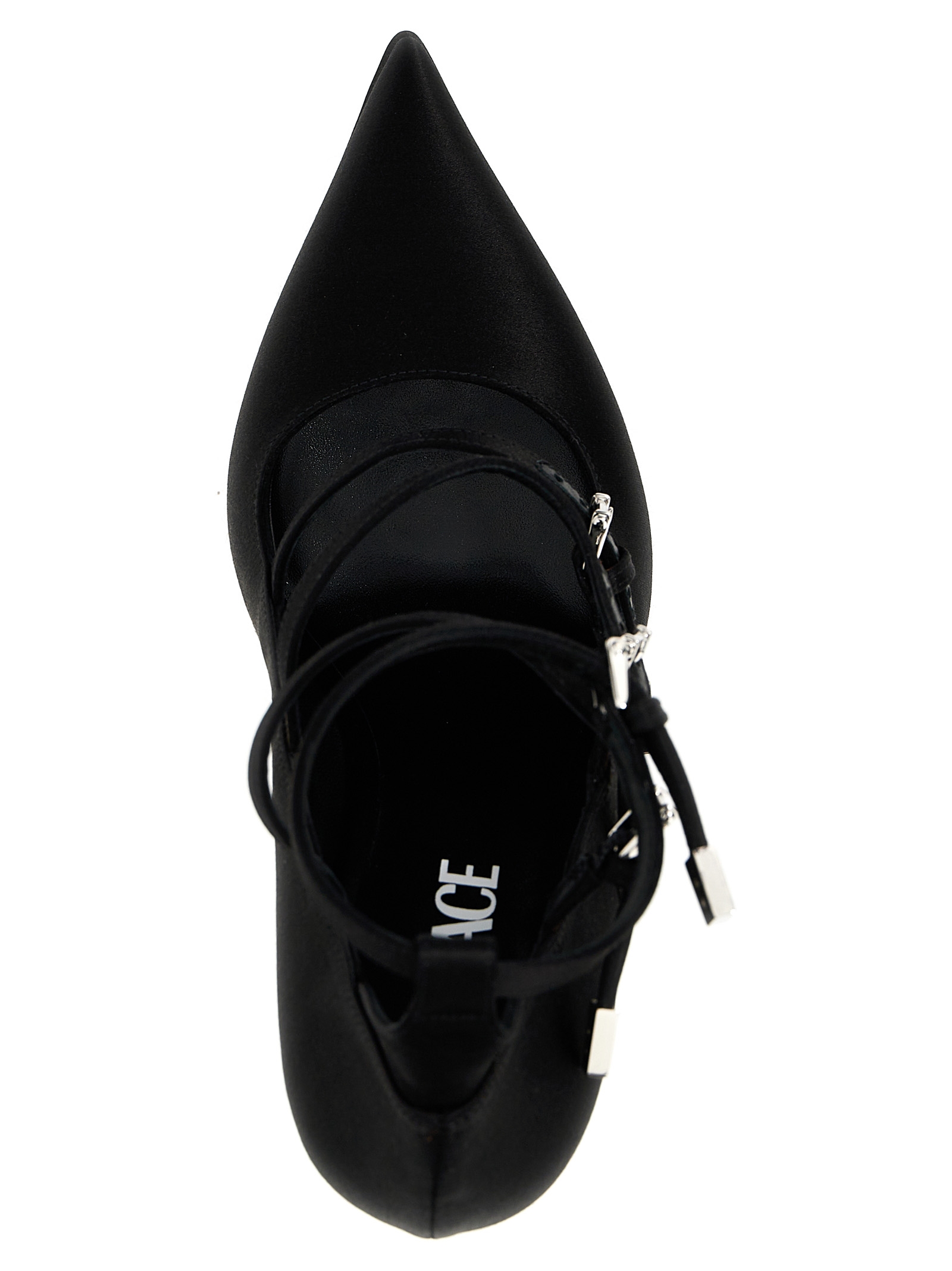 Storm’ ‘Storm Storm’ satin, pointed toe pumps with heel and plateau, V-shaped metal details on the straps with adjustable buckle.