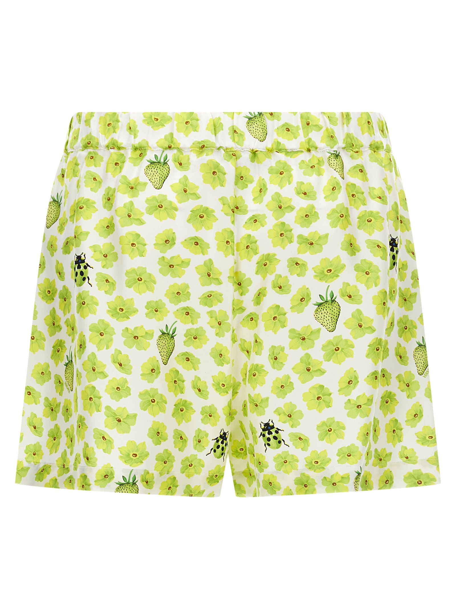 ‘Strawberry Garden’ print silk twill shorts, pajama model, elastic waistband, button flap, pockets.