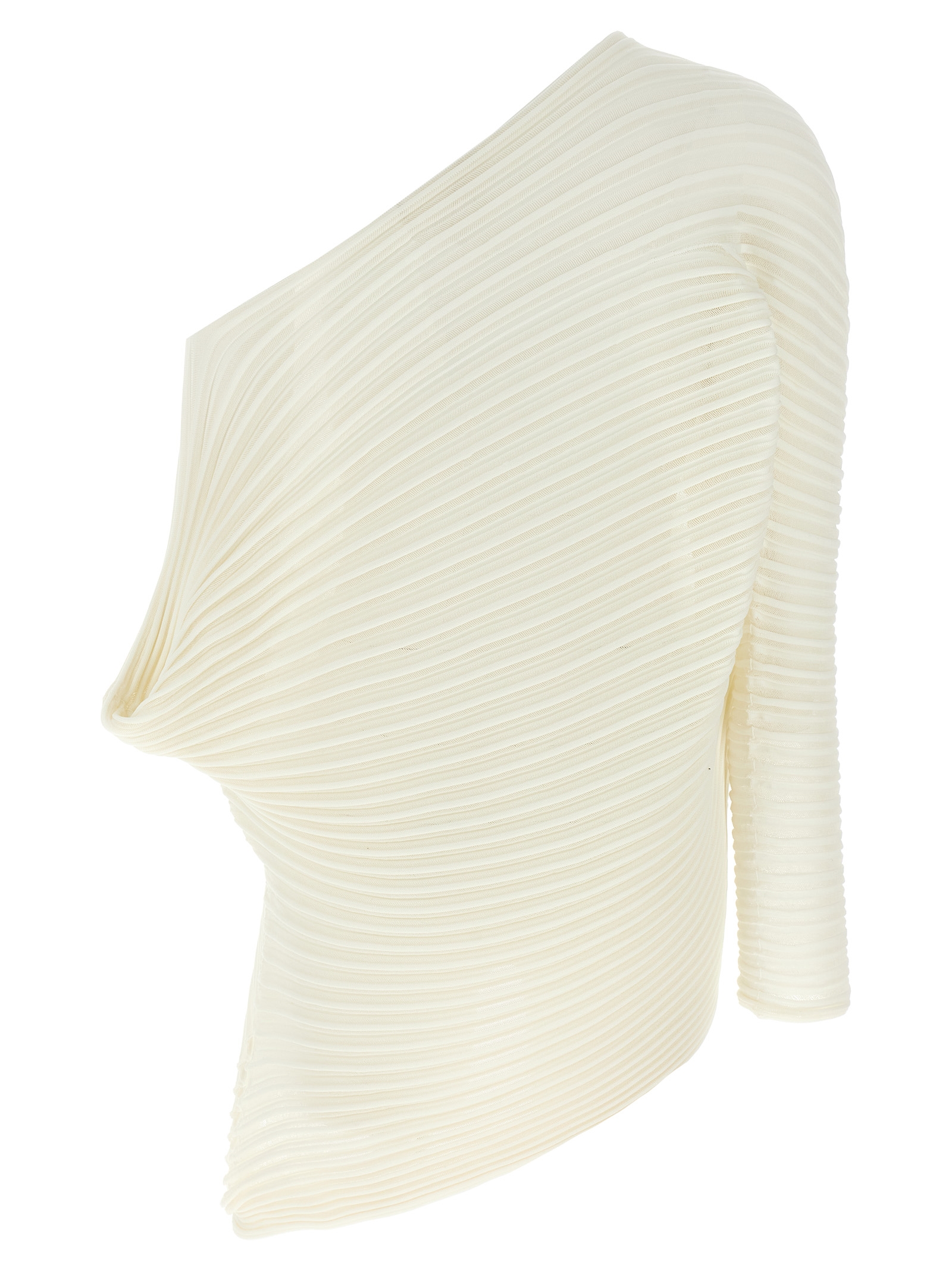 ‘Stream’ pleated knit top, asymmetrical, crew neck.