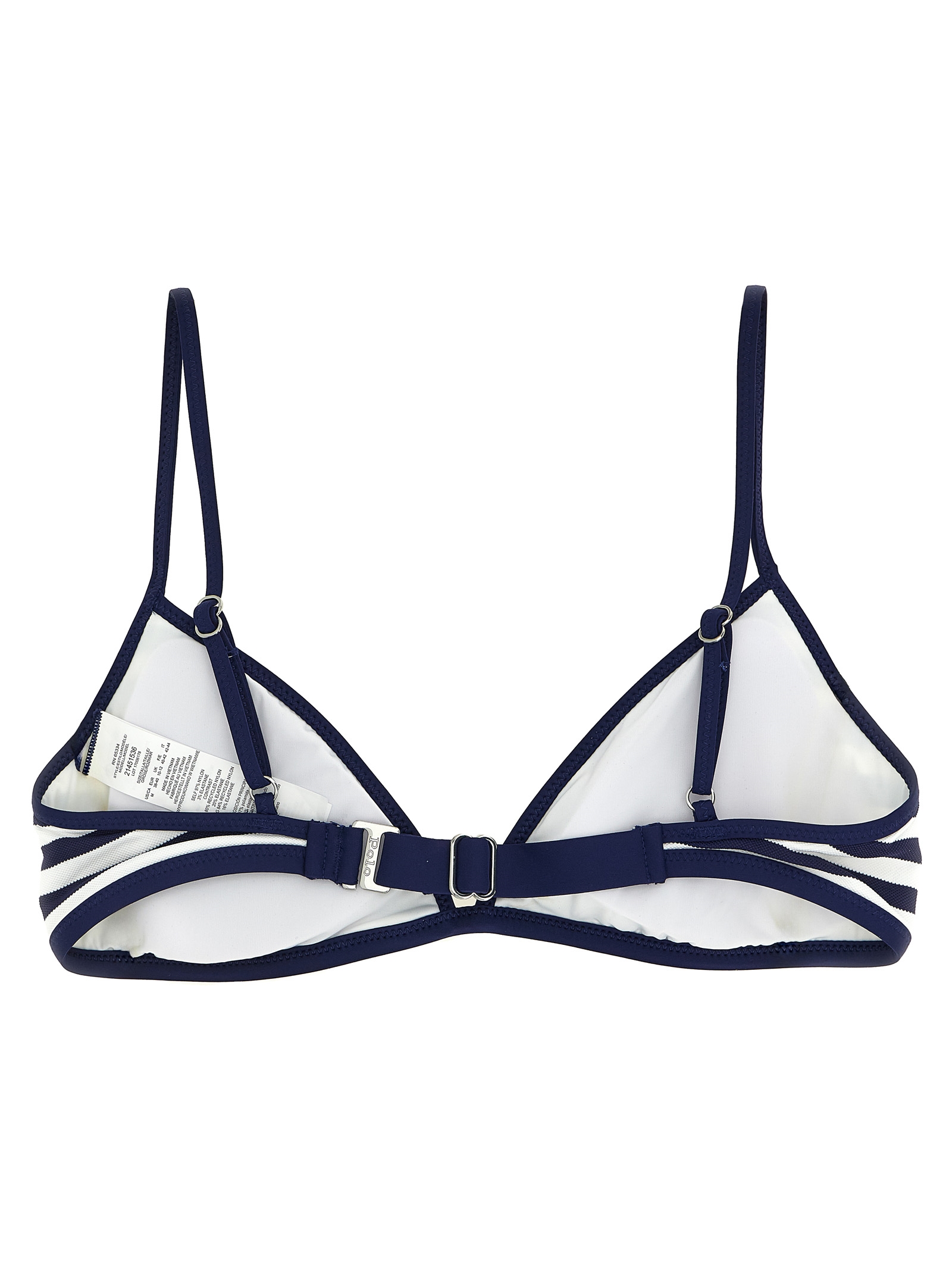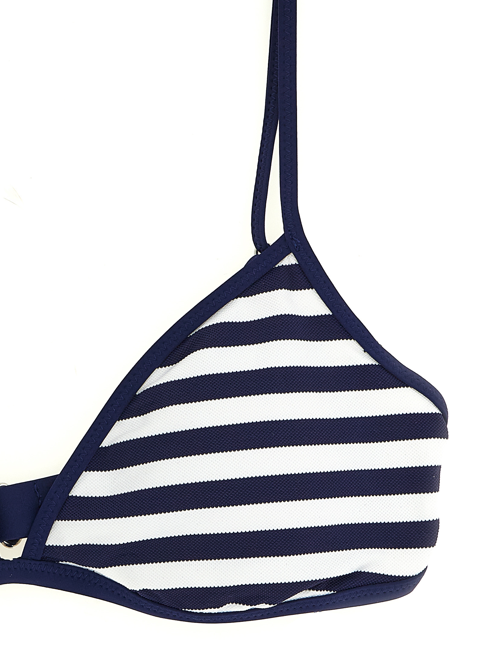 Bikini top in striped pattern piqué technical fabric, triangle design, removable cups, thin adjustable straps, adjustable hook closure at the back.