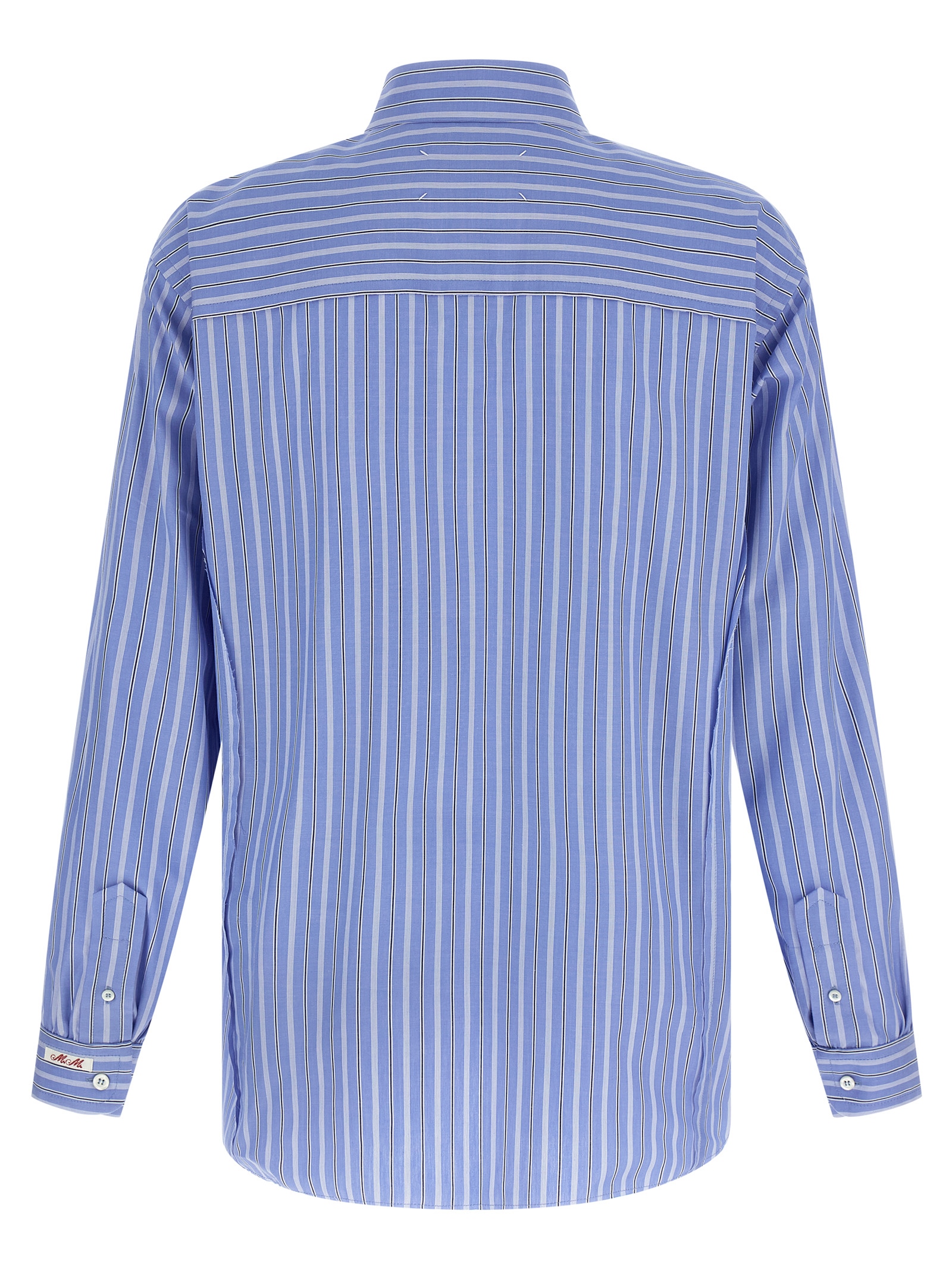 Striped cotton poplin shirt with raw cut hem details, front button closure, long cuffed sleeves, asymmetric hem, and ‘Four stitches’ at the back.