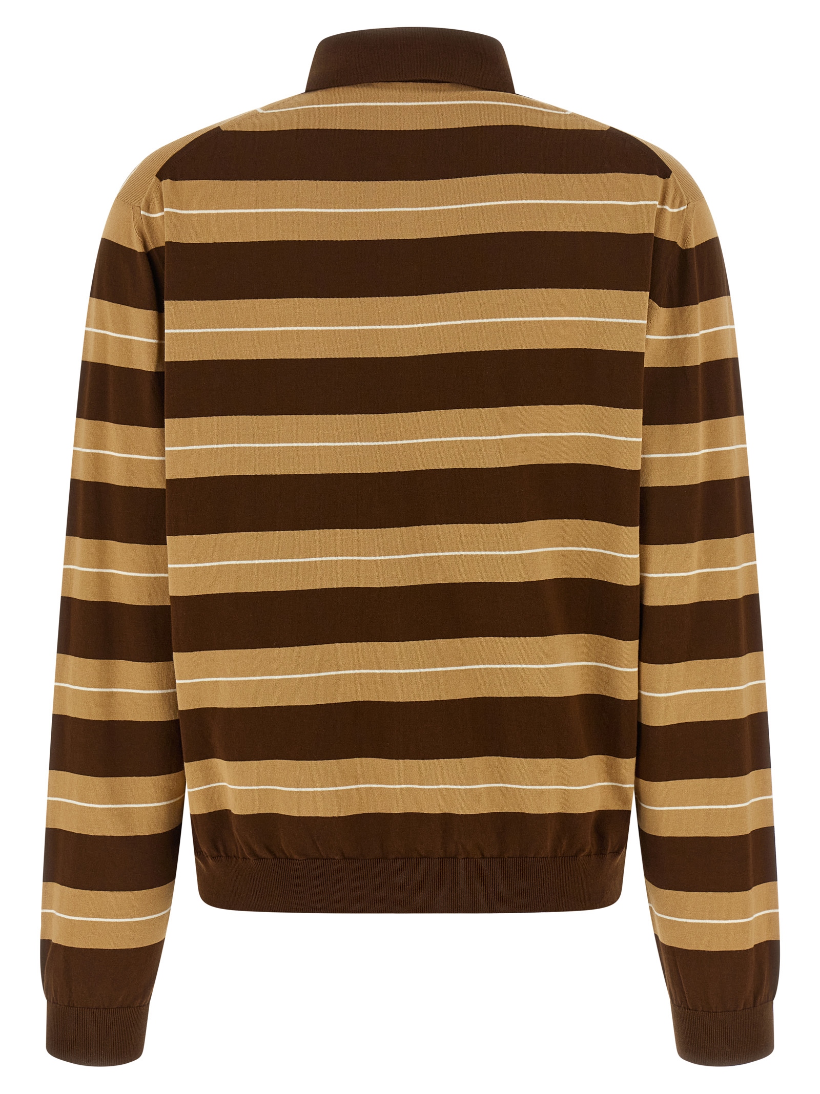 Striped cotton knit polo shirt with collar, three button closure, front logo, long sleeves.