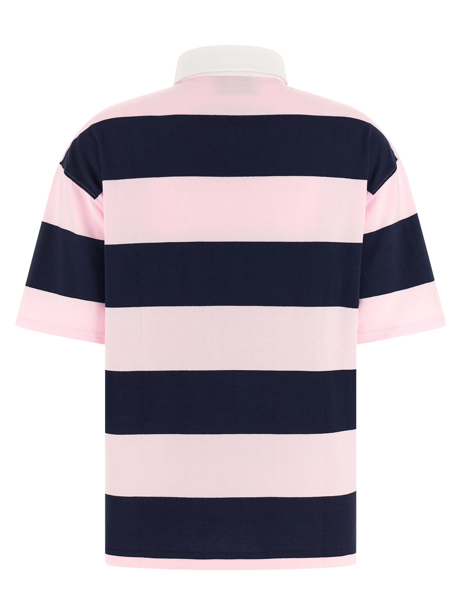 Striped cotton polo shirt with front logo embroidery, contrast collar, concealed buttons, and short sleeves. Side slits.