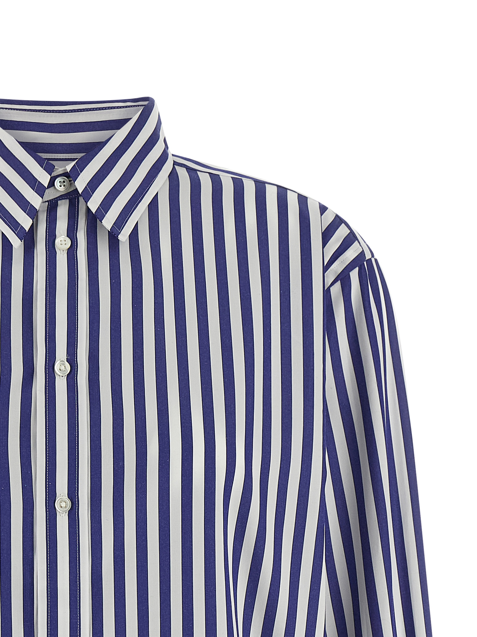 Striped cotton poplin shirt, front button closure, long sleeves with dropped shoulders and cuffs with logo embroidery, rounded hem.