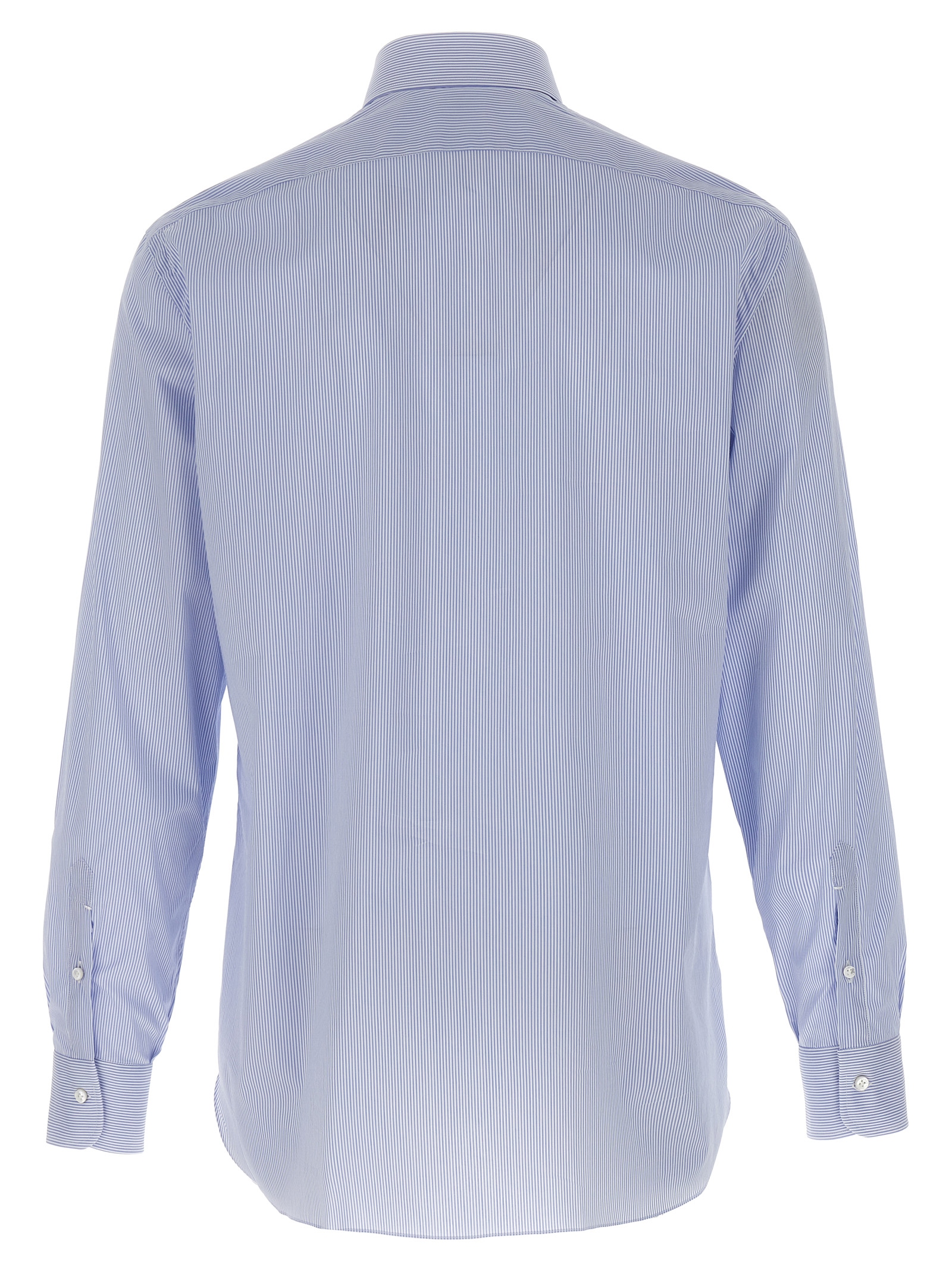 Striped cotton poplin shirt with front button closure, long cuffed sleeves.
