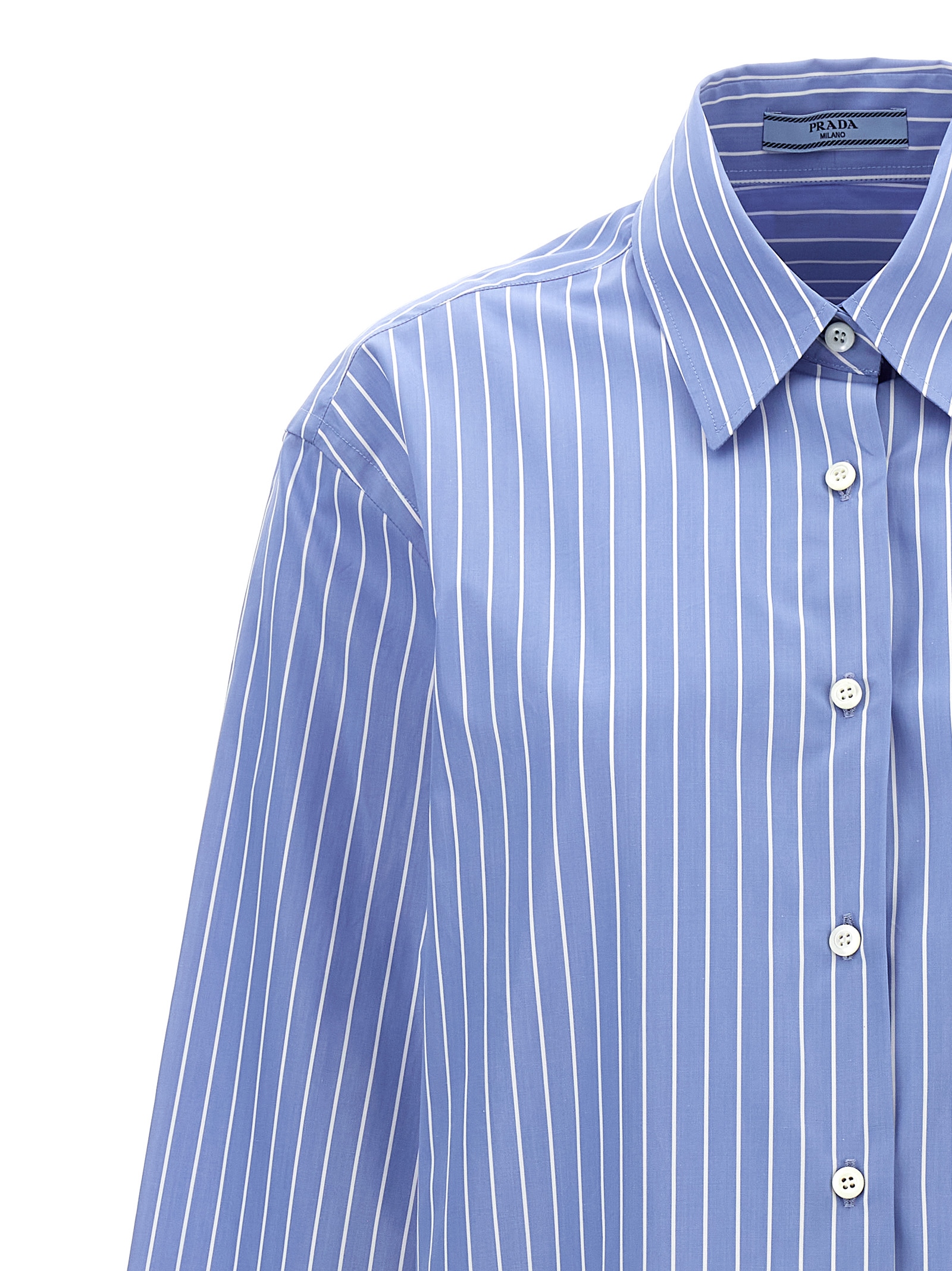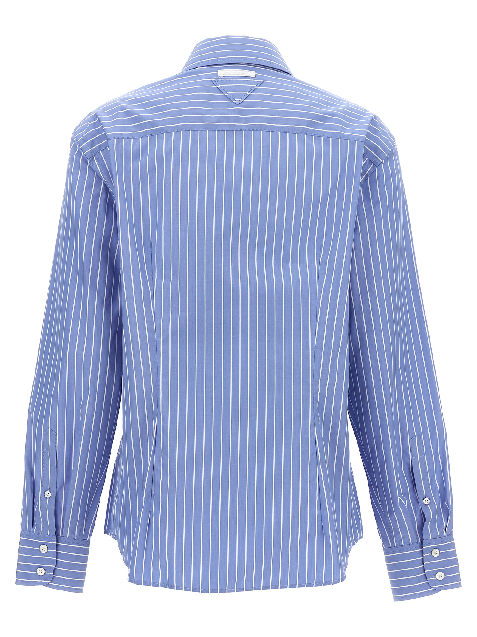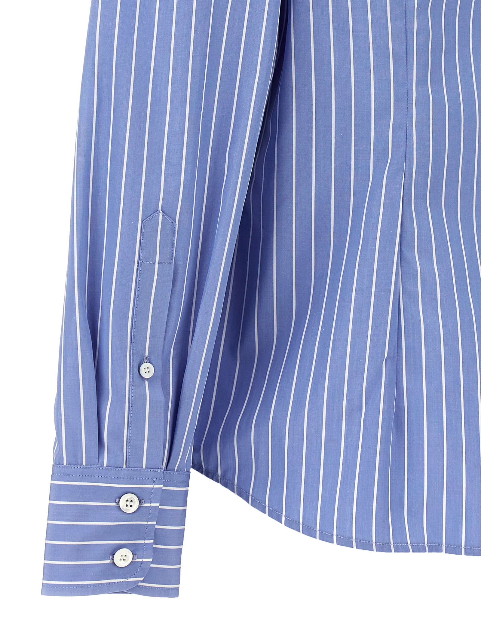 Striped cotton poplin shirt, front pocket, button closure, long cuffed sleeves.