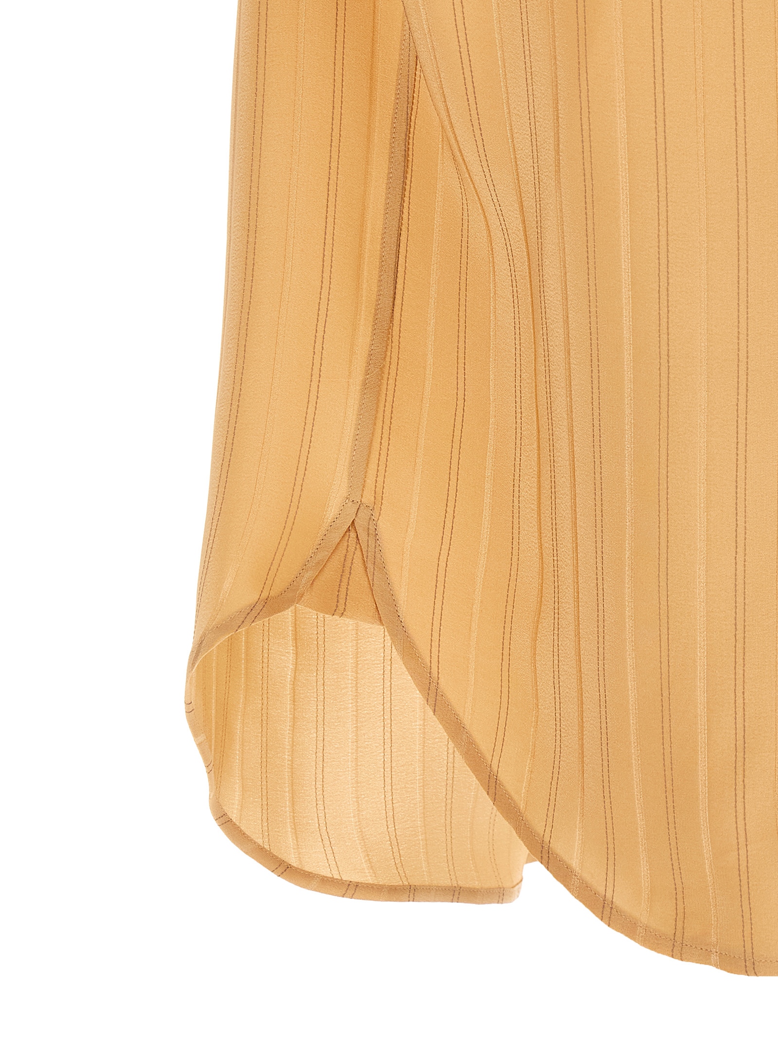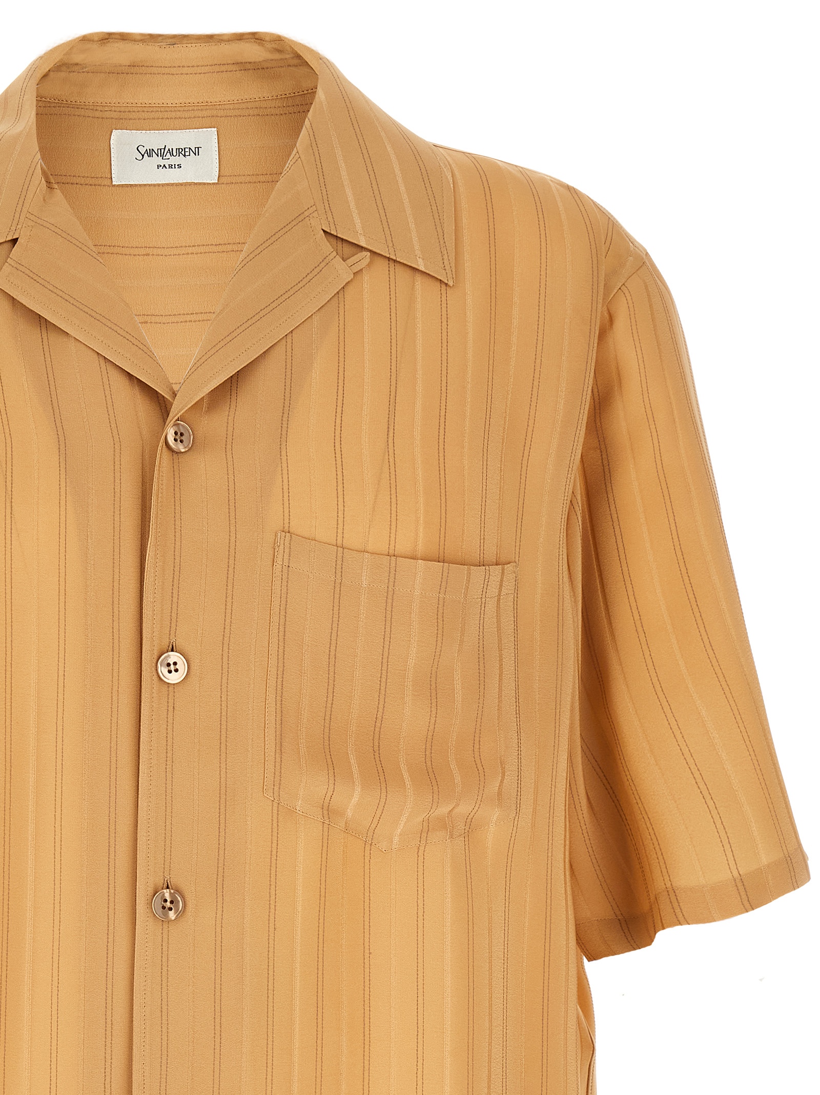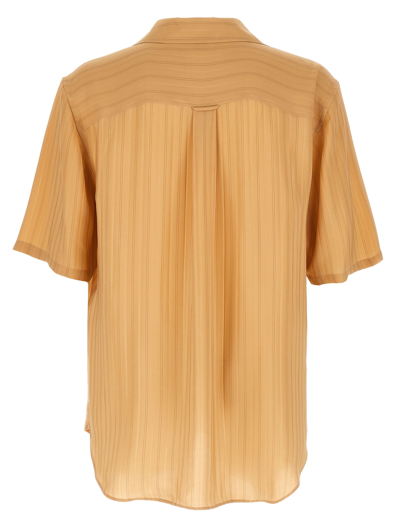 Striped silk shirt, French collar, breast pocket, front button closure, short sleeves with slightly dropped shoulders, rounded hem.