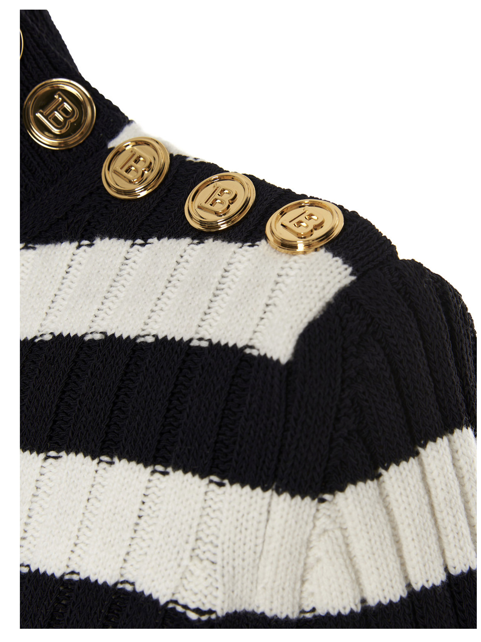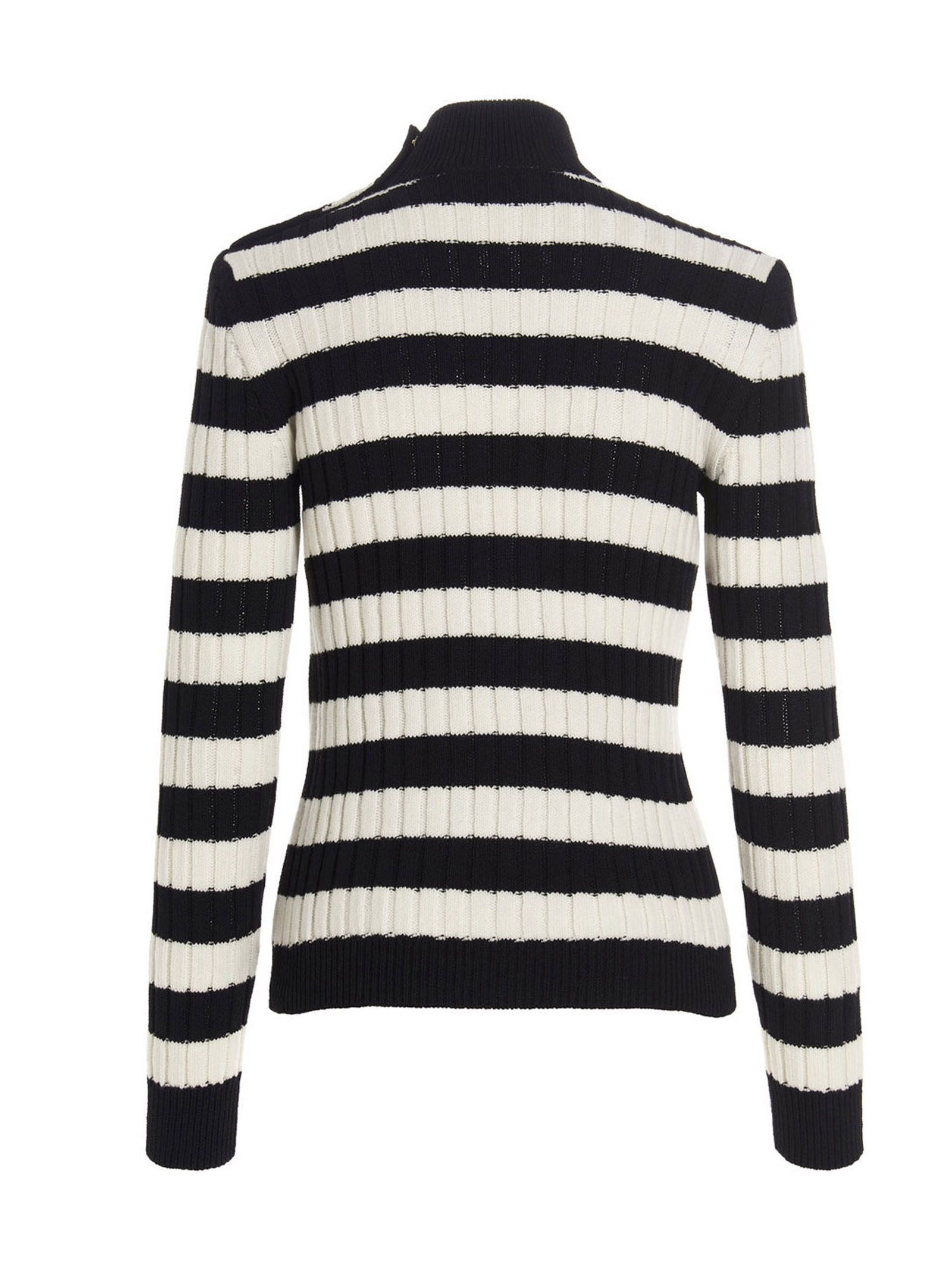 Ribbed virgin wool sweater featuring a striped pattern, a turtleneck and gold logo buttons.