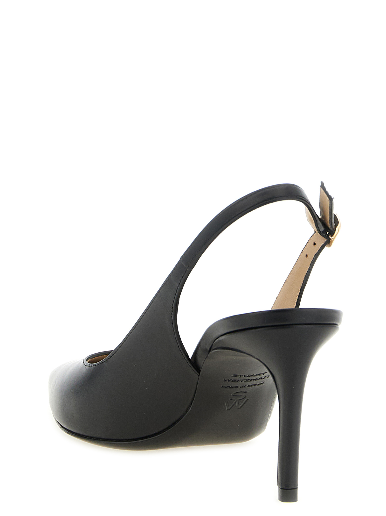 ‘Stuart Power’ smooth calf leather slingbacks with tapered toe, modernized construction for extra support, adjustable strap, covered stiletto heel, foam insole, leather sole.