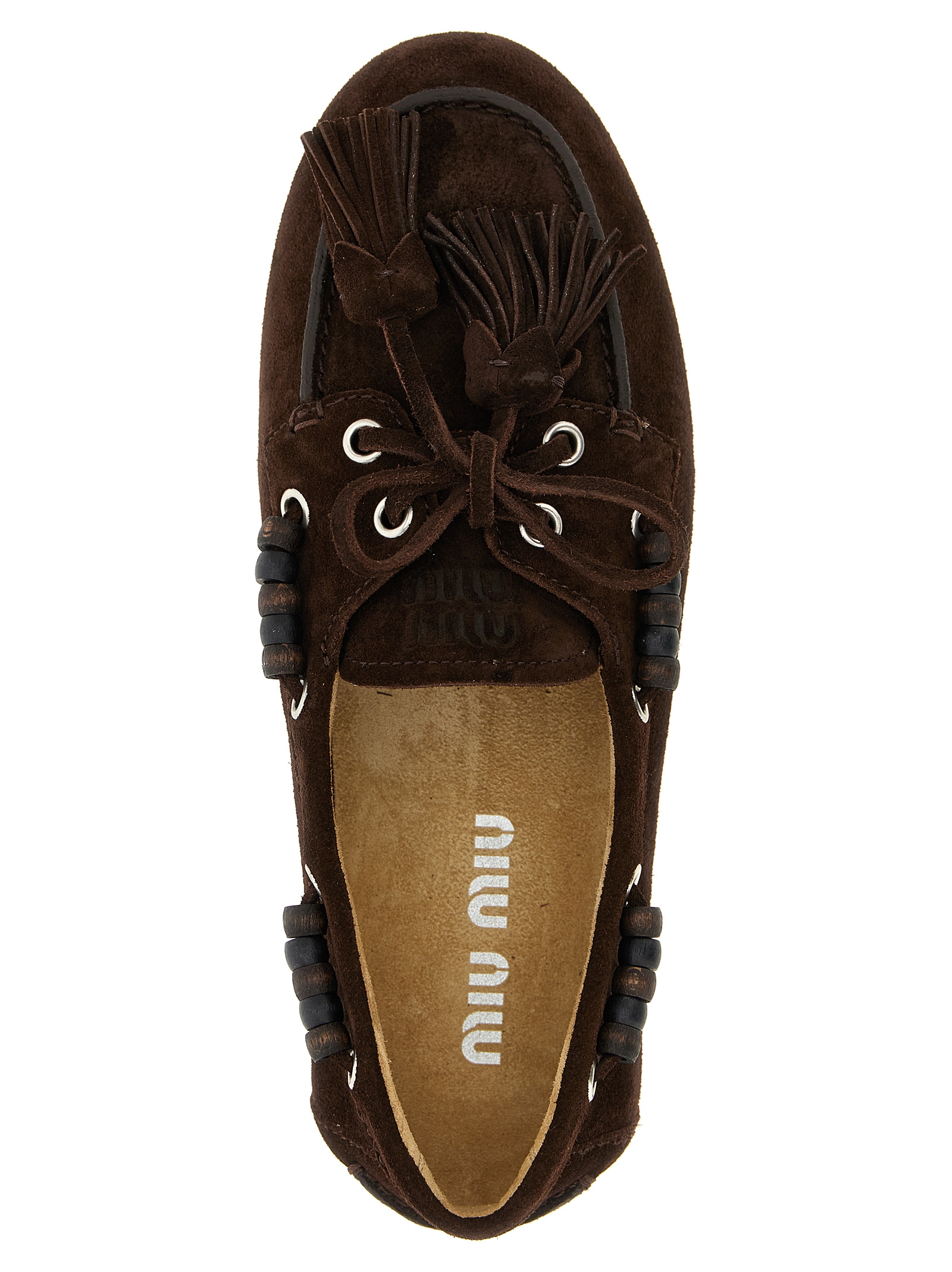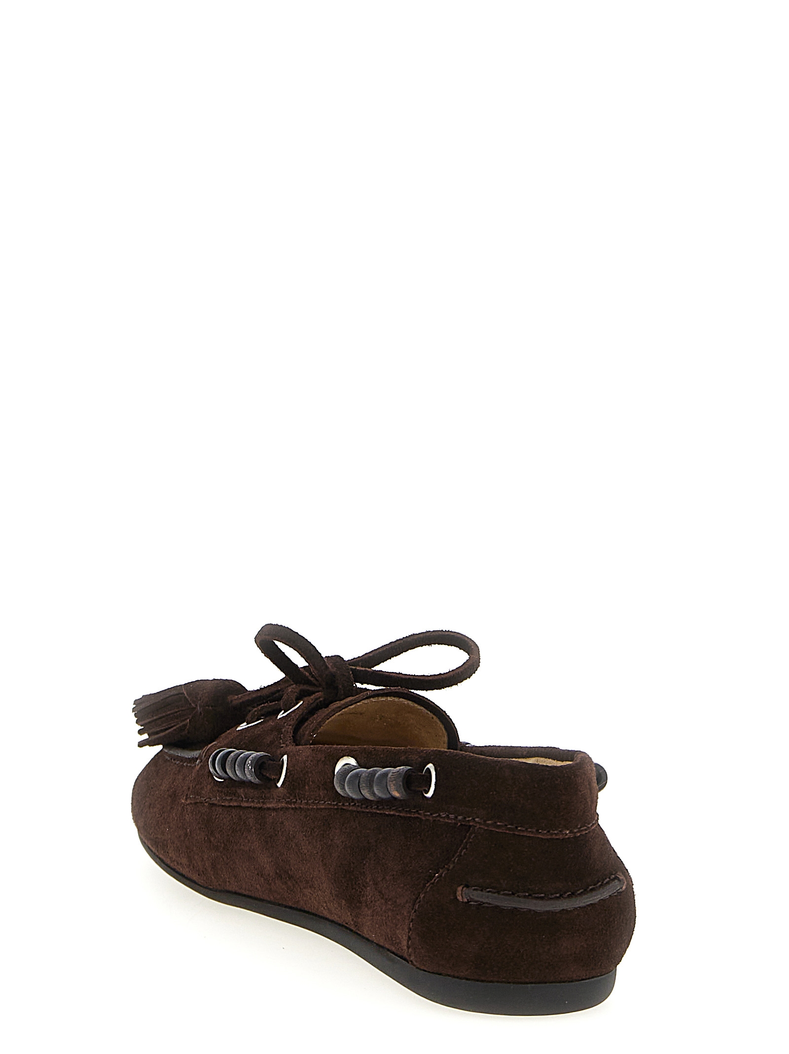 Suede boat shoe with tassel and beads detail, embossed logo on the tongue, rubber sole.