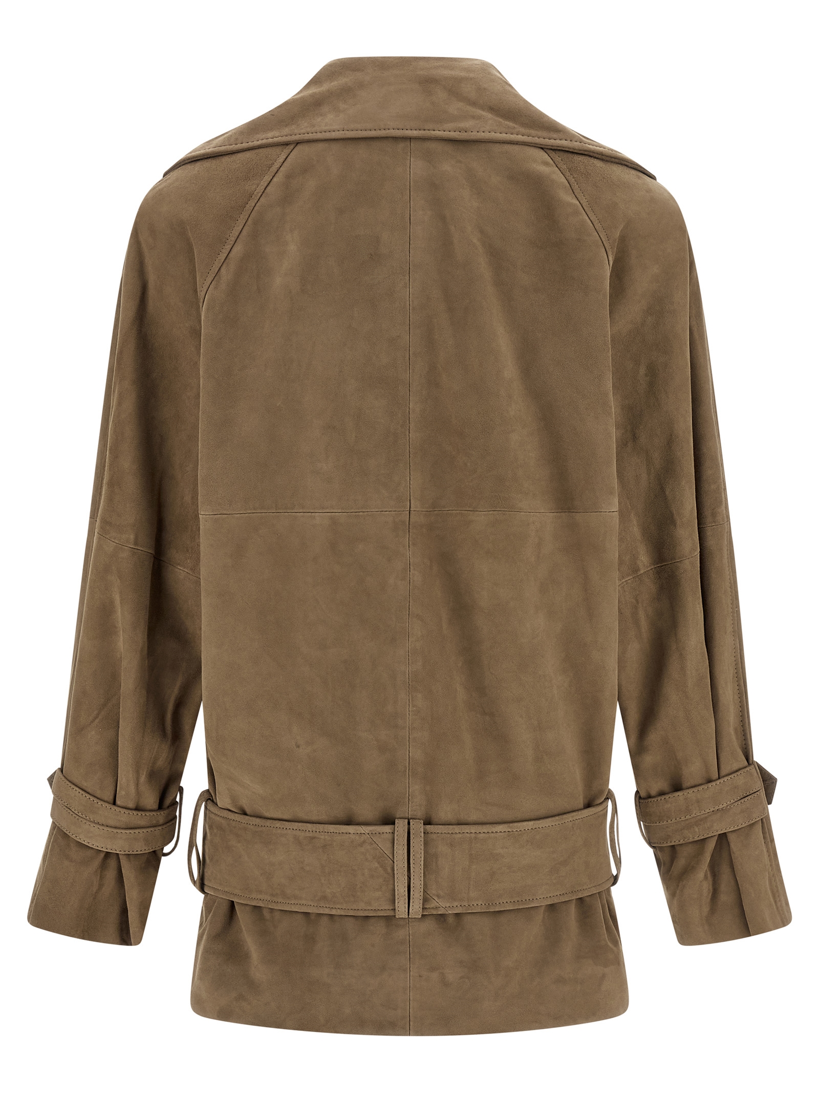 Double-breasted suede jacket with front button closure, wide button-up lapel collar, pockets, long raglan sleeves with cuffs, lining, and removable belt.