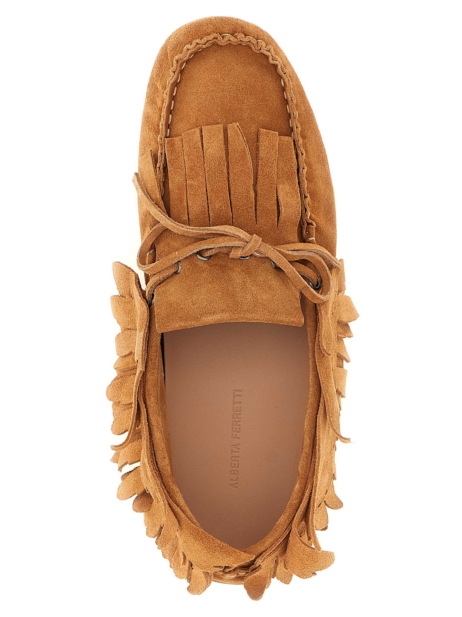 Suede loafers with tone-on-tone fringes, almond toe, tie-up strap, rubber sole.