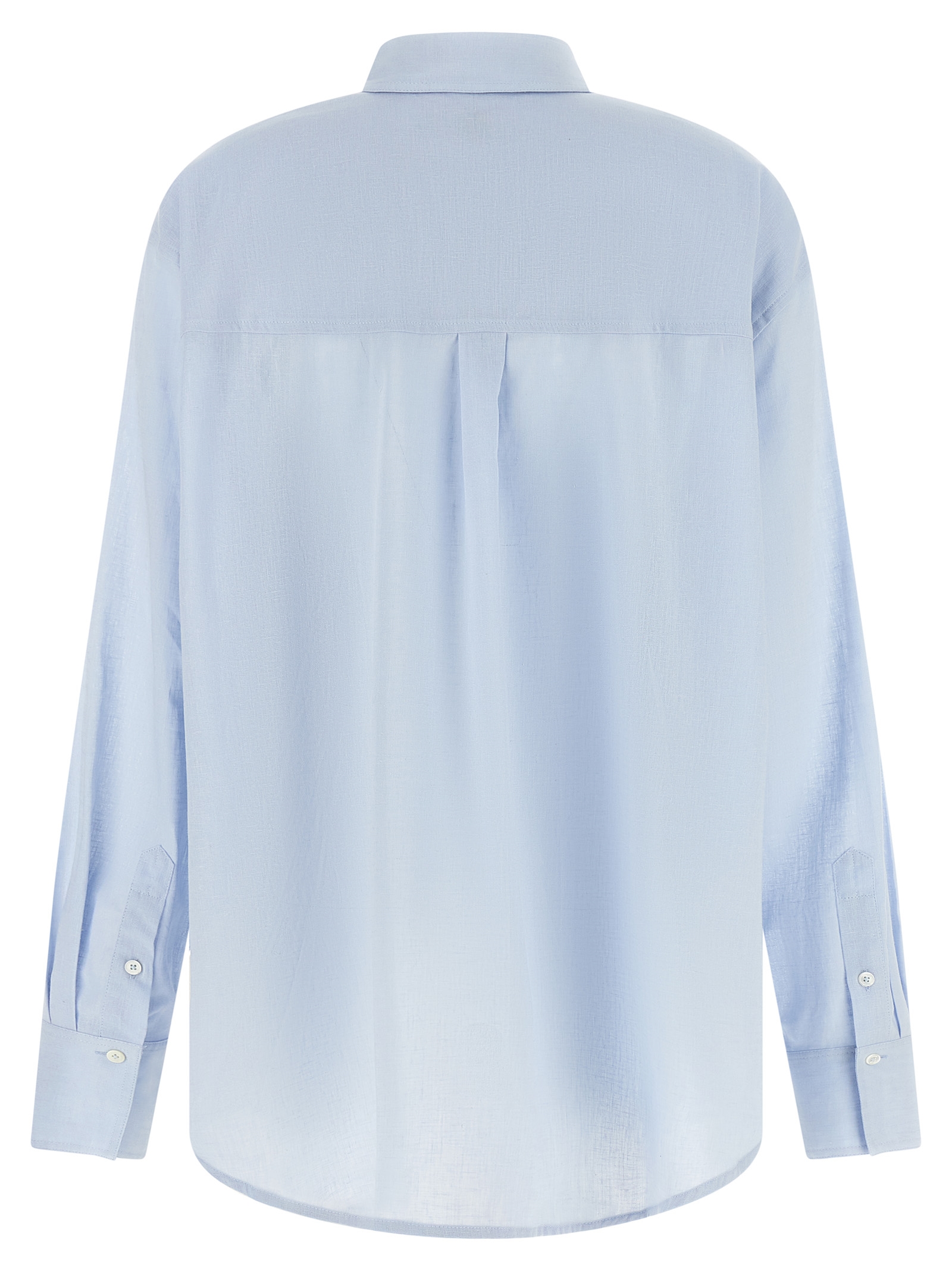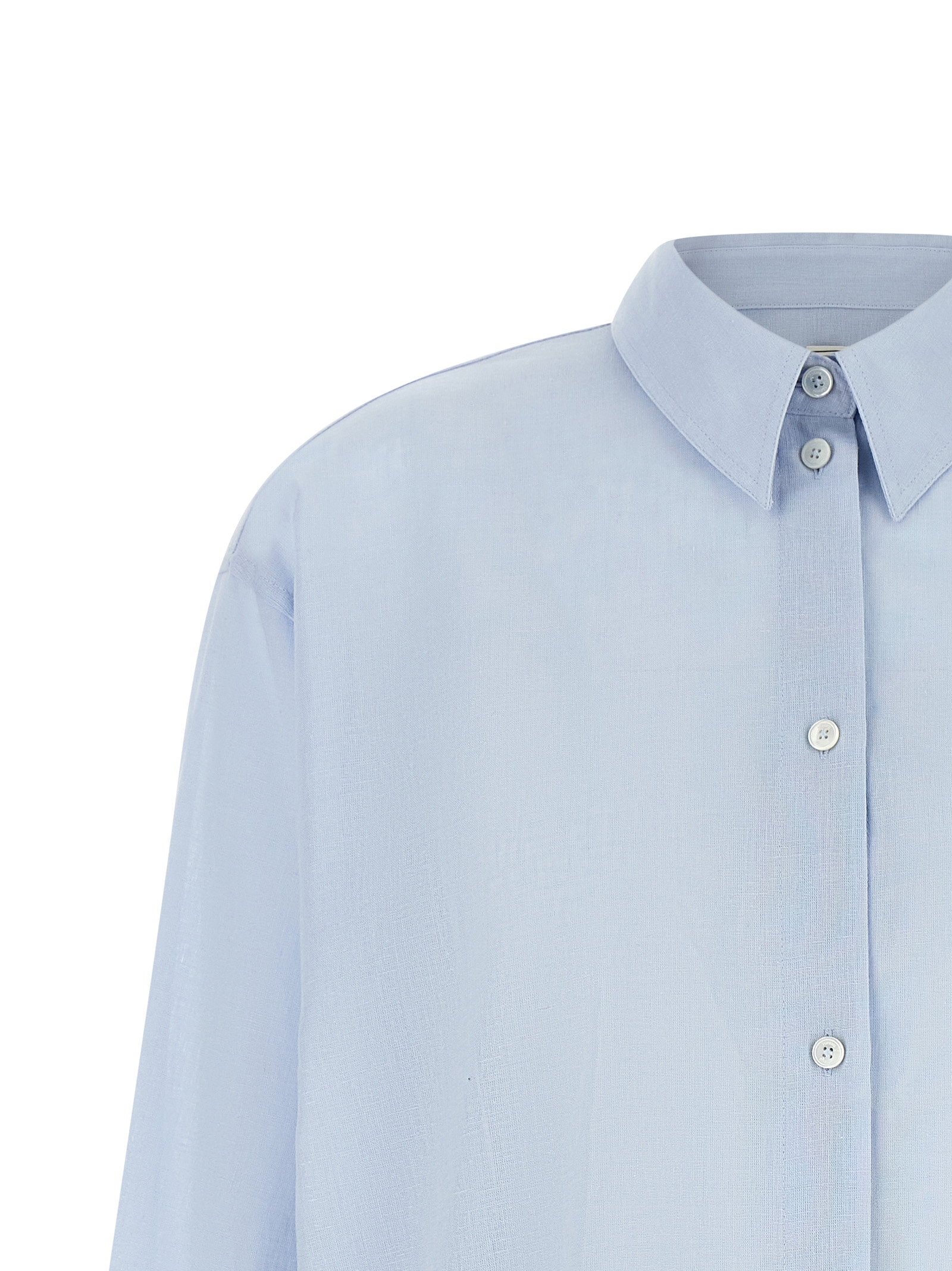 ‘Summer’ shirt in a light breathable and slightly transparent blend of linen and cotton, tone-on-tone embroidered logo and front mother-of-pearl button closure, pointed collar, long sleeves with cuffs and dropped shoulder, rounded hem.